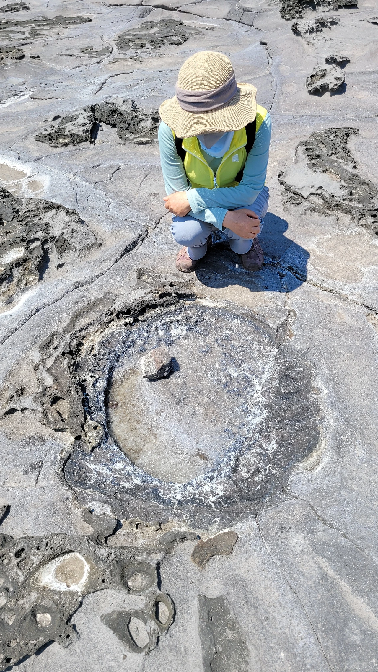 초등학생 두 명이 엄마 아빠와 함께 둘러앉아 열심히 관찰하고 있다. 무언가 싶어 들여다본다. 얼음이 언 것 같다. 이 더운 날씨에 무슨 얼음인가 하고 손가락을 대어 본다. 소금이다. 평평한 암반 위에 움푹 팬 곳이다. 바닷물이 고여 있다가 물이 증발하고 소금 결정이 생긴 것이다. 빙판처럼 보인다.