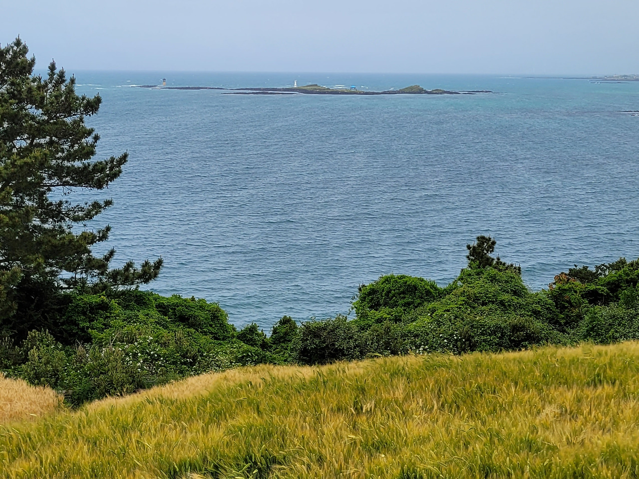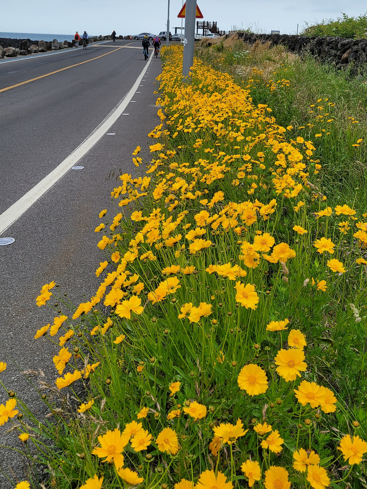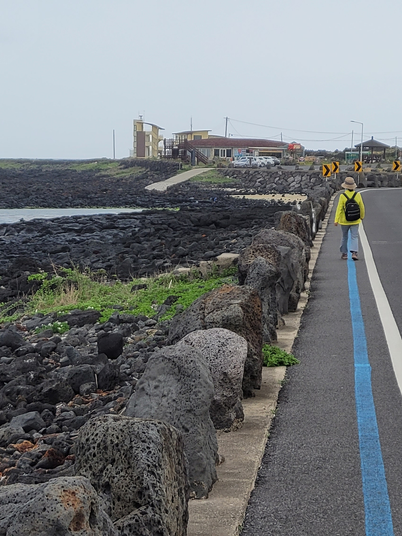 올레는 밭담길을 뒤로하고 조천 해안도로로 이어진다. 자전거가 자주 옆을 지나간다. 단조로운 아스팔트 길은 보도가 좁아 신경이 쓰이지만, 길가에 무리 지어 핀 큰금계국을 보는 재미가 쏠쏠한 길이다.
