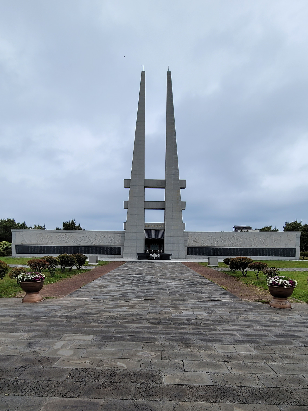 애국선열 추모탑. 제주의 고유한 정주문(정낭)을 형상화한 추모탑이다.(우)