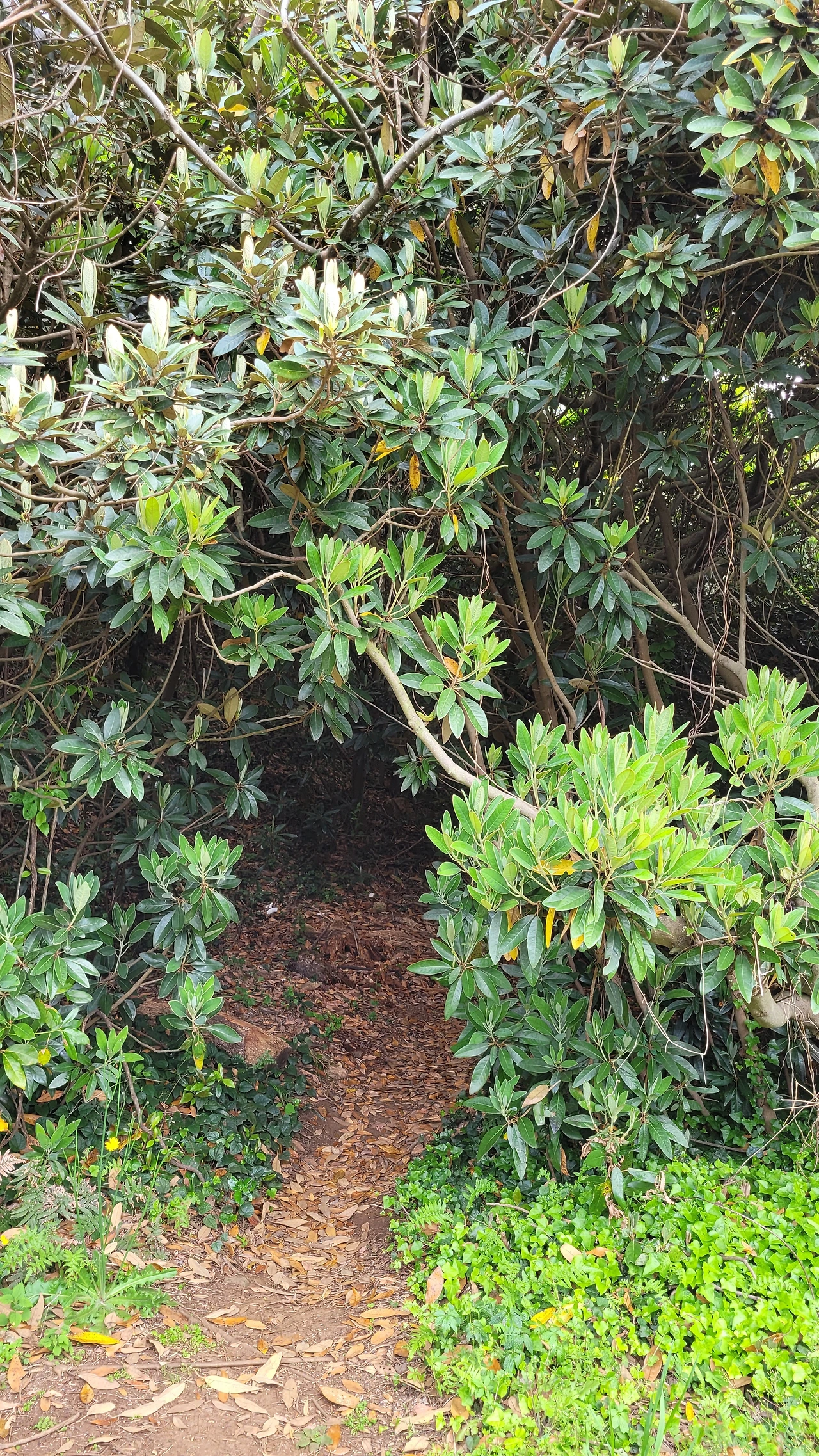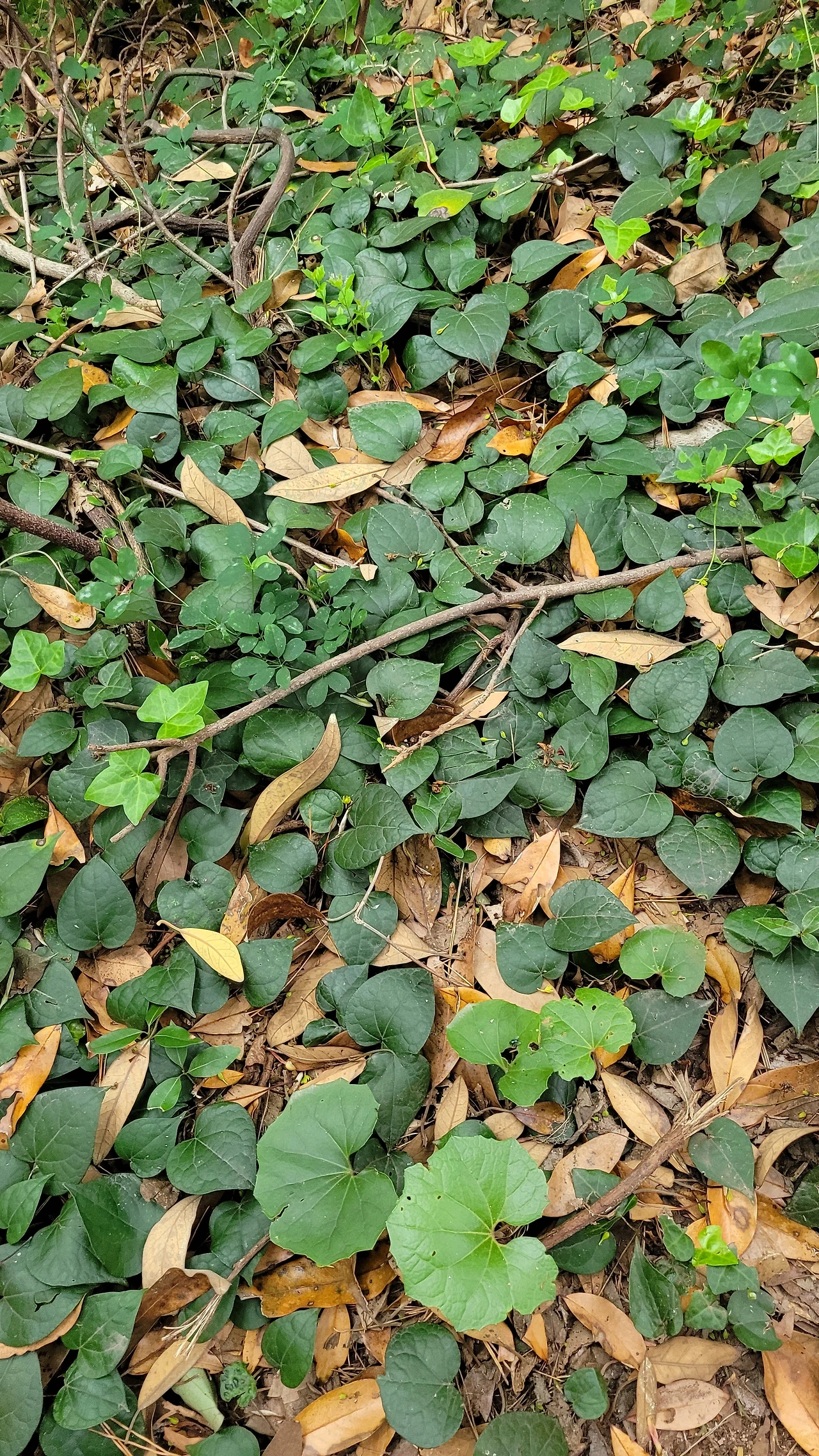 활엽수가 우거진 산책로에 후추등이 지피를 덮고 있다.