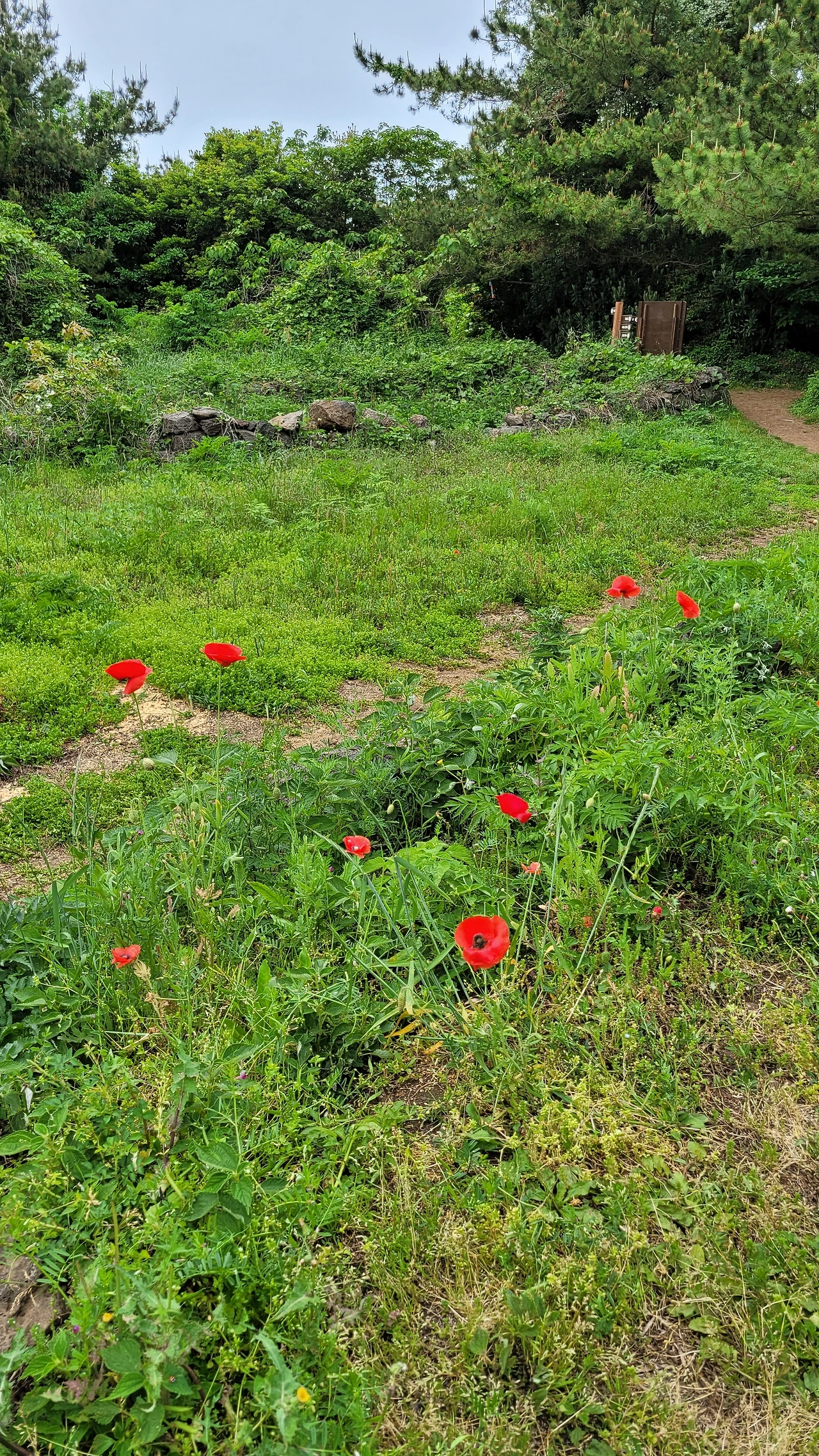 정자를 지나 얼마 가지 않아 안부에 닿는다. 우리는 망오름과 서우봉 사이로 난 평탄한 길을 선택한다. 까마귀쪽나무, 줄사철나무, 굴거리나무, 털머위, 관중, 도깨비쇠고비, 제주조릿대 등으로 컴컴한 나무 터널을 형성하고 있다. 좁은 길과 풀밭이 번갈아 나타난다. 빨갛게 핀 개양귀비가 4.3 때 희생된 주민들이 흘린 붉은 피를 연상케 한다.
