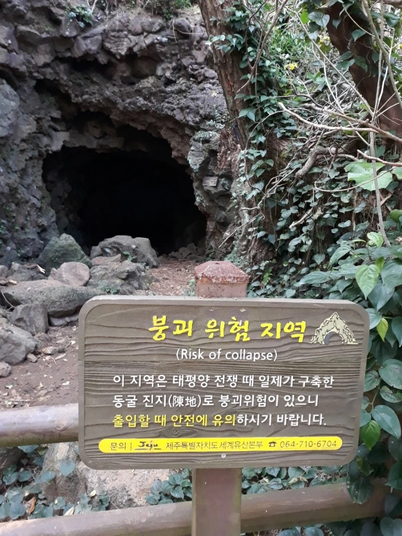 시멘트 포장길로 이어진다. 일제 동굴진지 안내판이 서 있다. 일제는 패전 위기에 몰리자, 제주도민을 동원하여 서우봉 해안 절벽에 동굴진지 18곳, 벙커 2곳을 구축하였다. 이 동굴진지는 연합군 함대를 직접 공격하는 자살공격용 무기를 배치하였던 곳이다.