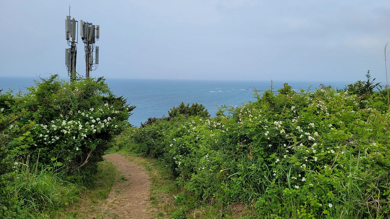 통신 기지국 중계탑이 보인다. 찔레꽃이 하얗게 핀 내리막이 꼬불꼬불 이어진다.