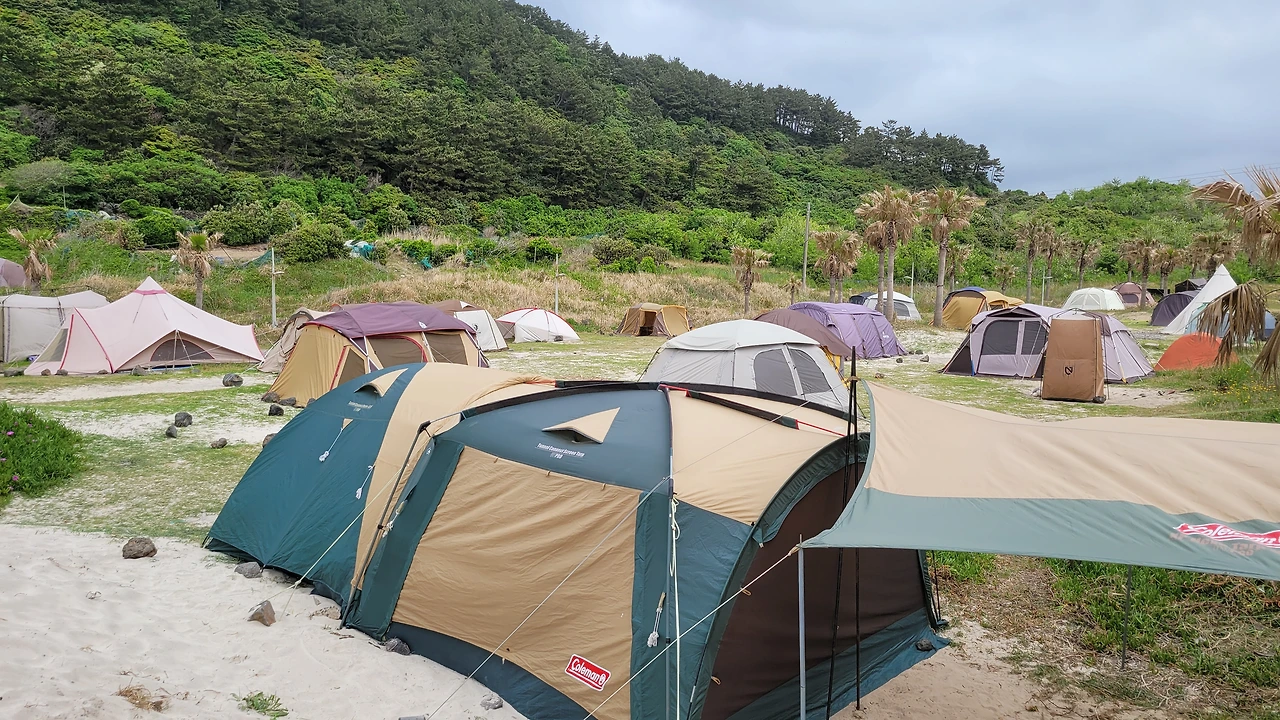 함덕해수욕장은 서우봉 산책로 들머리에 넓은 야영장를 갖추고 있다.