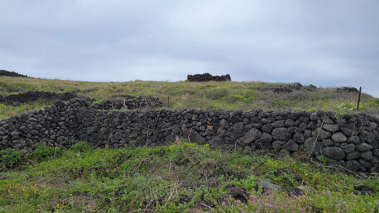제주항일기념관 뒤를 돌아 나와 밭담길을 걷는다. 마늘밭과 청보리밭이 이어진다. 돌담 너머 청보리가 바닷바람에 흔들린다. 밭담 곁에 노란 큰금계국과 하얀 찔레꽃이 피어 있고, 포도송이같이 검게 익어가는 송악이 돌담을 덮고 있다.