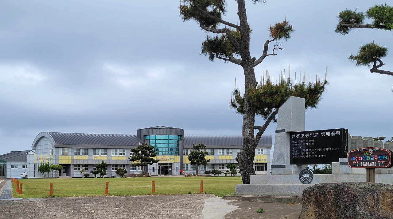신흥리 사무소를 못 미쳐서 폐교된 신흥초등학교가 있다. 지금은 제주국제교육원 제주다문화교육센터로 활용되고 있다. 입구에 옛 배움터를 기리는 빗돌이 서있다.