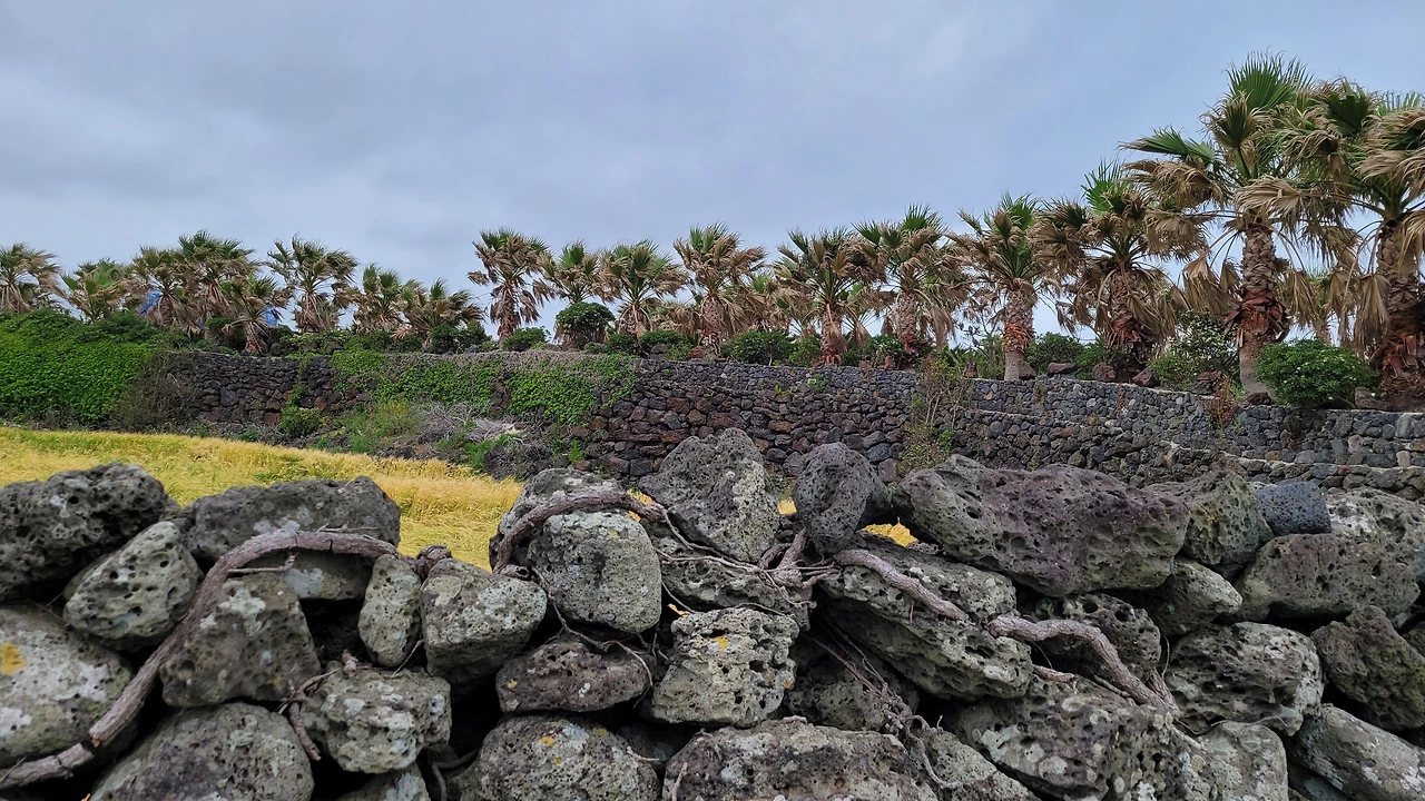 신흥리 환해장성을 지나간다. 멀리 언덕 위에 왜포연대가 보인다. 돌로 만들어진 밭담 너머 누렇게 익어가는 보리밭, 뒤에 방풍림처럼 서 있는 야자수, 환해장성, 연대 등의 풍경이 해변과 잘 어우러져 제주 섬만의 독특한 분위기를 자아낸다.