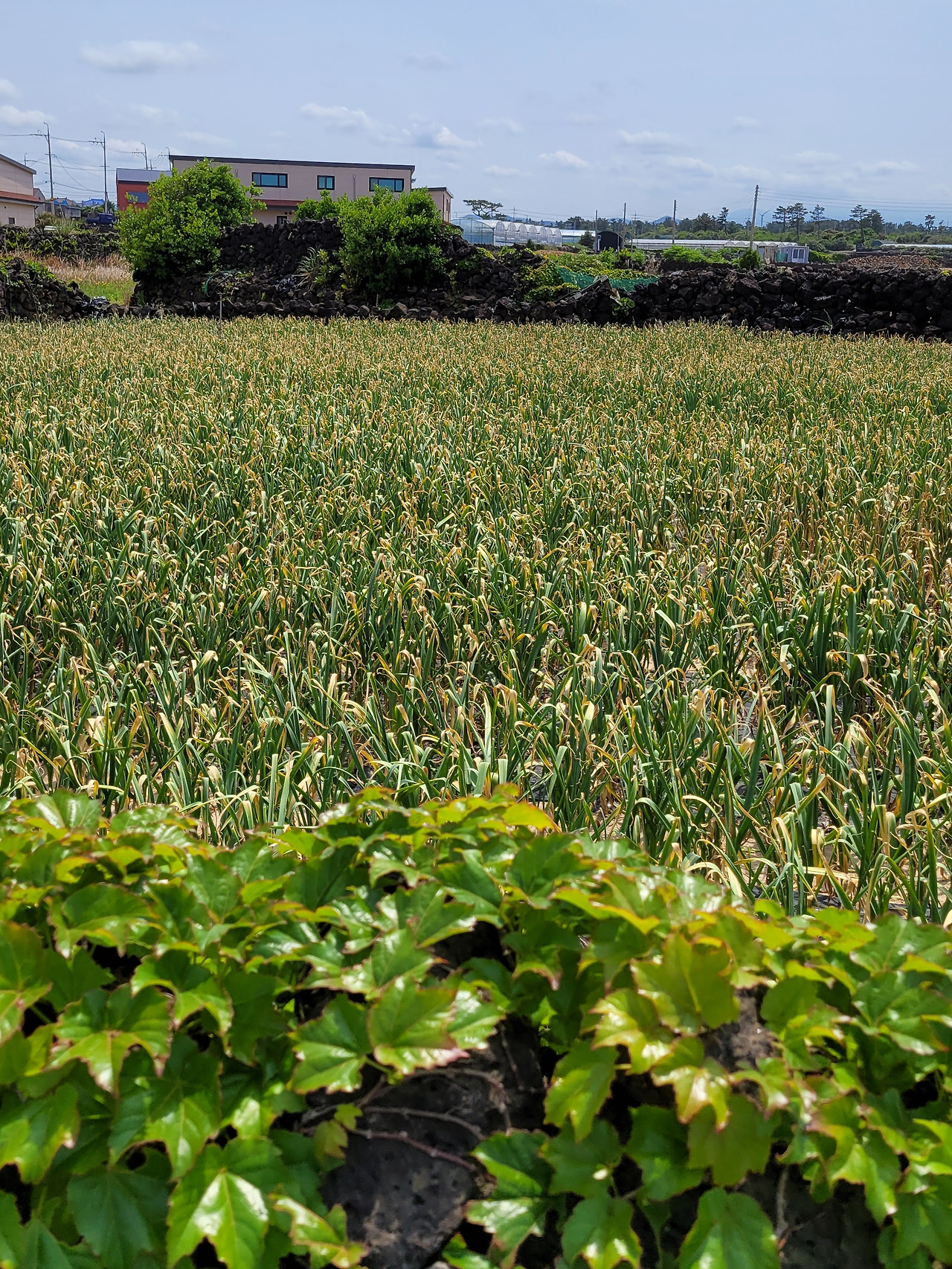 밭담이 이어진다. 마늘이 수확을 기다리고 있다. 돌담에는 담쟁이가 타고 오른다.
