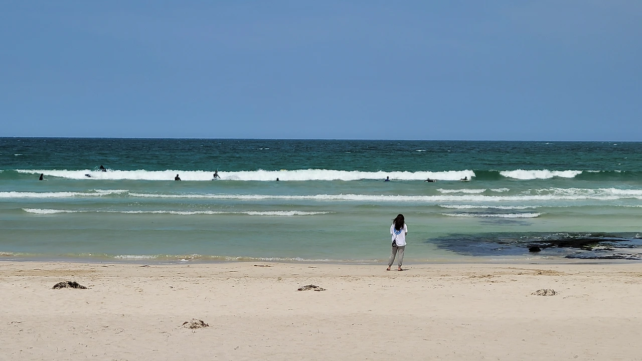 멸치잡이로 유명하였던 월정 해변은 옛 이름이 한모살이었다. '크고 넓은 모래밭'이라는 뜻을 담고 있다. 한모살 해안 주변으로 관광객이 모여들면서 민박집, 펜션, 카페 등이 줄이어 들어서더니 지금은 카페거리가 되었다. 상가의 대형 거울에 비친 내 모습을 모처럼 카메라에 담는다.