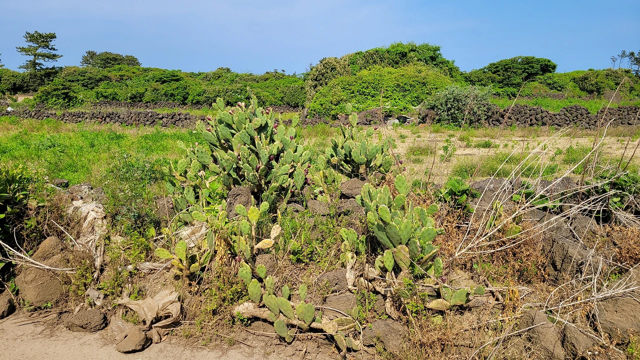 밭담은 계속 이어진다. 수확을 하고 새로운 작물이 심어지지 않은 밭에 유채와 잡풀이 자라고 있고 돌담에는 선인장이 언덕을 이루고 있다.