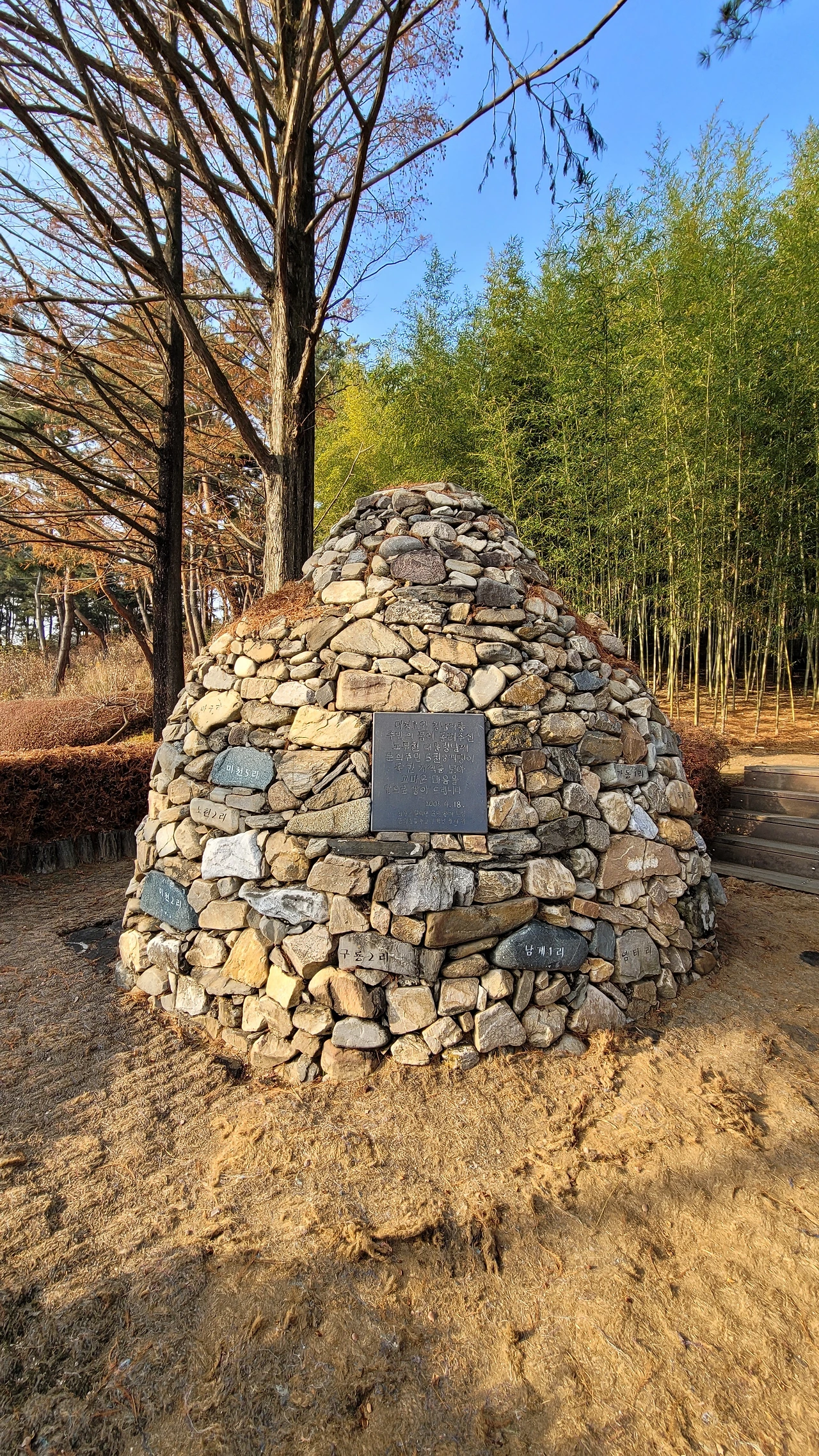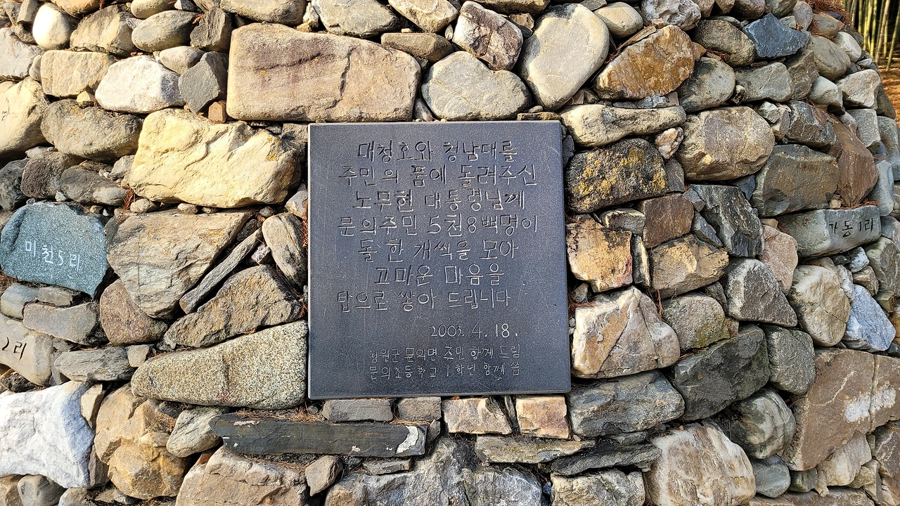 돌탑. '대청호와 청남대를 주민의 품에 돌려주신 노무현 대통령께 문의 주민 5천8백명이 돌 한개씩 모아 고마운 마음을 탑으로 쌓아 드립니다'는 글이 새겨져 있다.