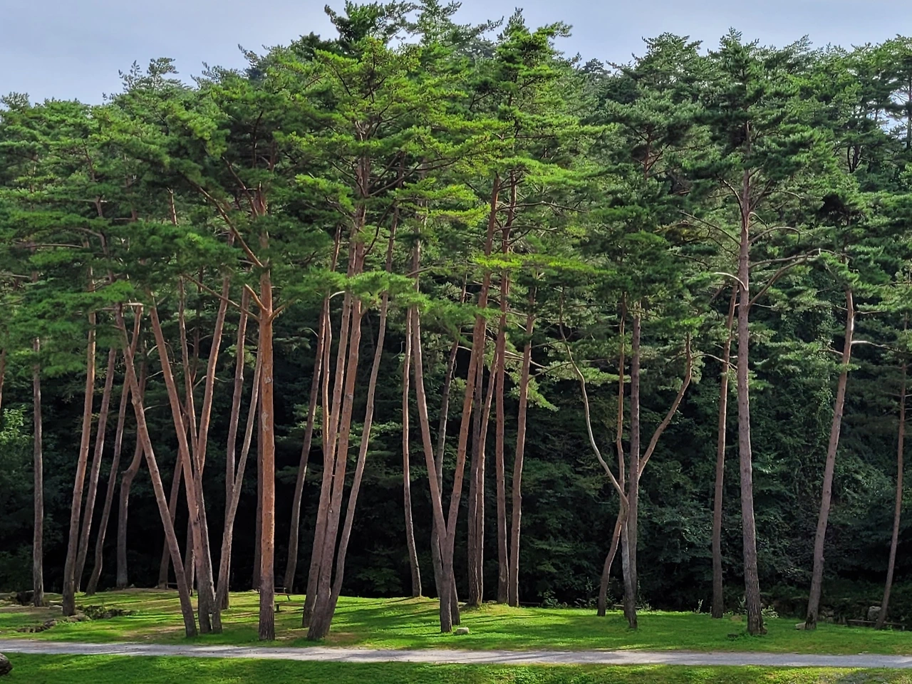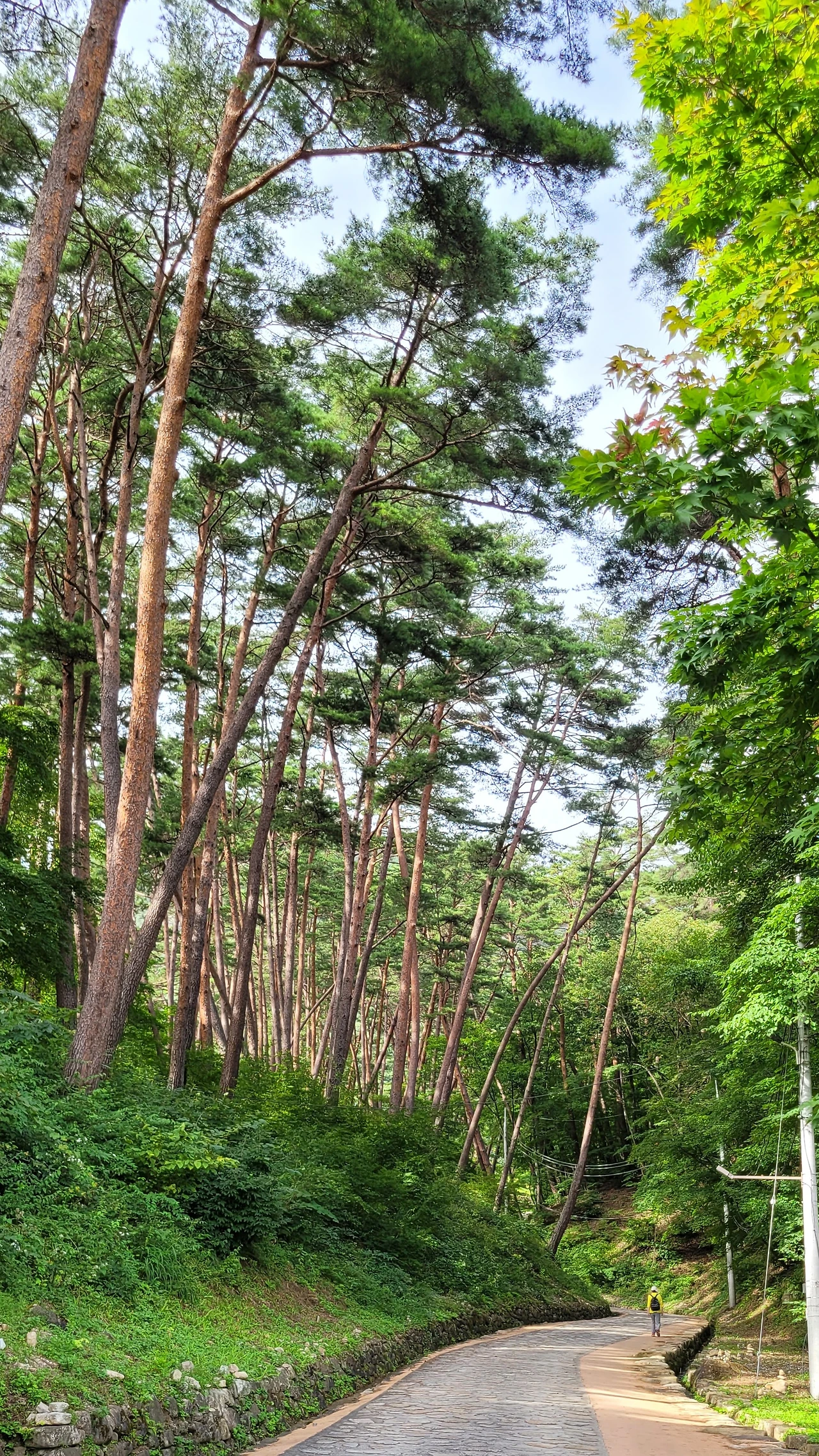 징효대사 부도와 탑비 오른쪽, 비탈길을 올라간다. 법흥사가 자랑하는 소나무 숲길이다. 늘씬한 키의 줄기에 붉은빛이 나는 소나무 숲이 있다. 주차장 안내판에 '소나무 숲이 아름다운 절'이란 문구와 함께 적힌 고려 말기 고승 나옹선사의 시구가 실감 나는 길이다.