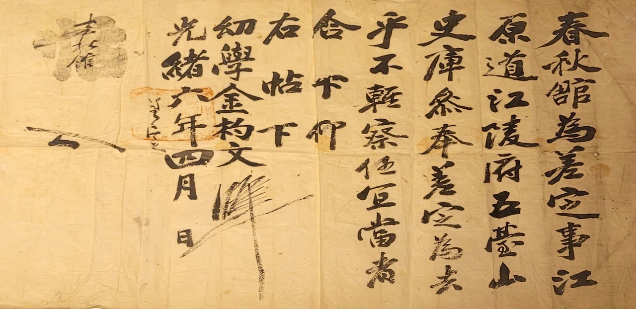 <참봉 교지> 이 교지는 1880년 오대산사고 담당 참봉으로 김문표라는 사람을 임명한다는 내용을 담고 있다. 사진 출처 : 월정사 왕조실록·의궤 박물관