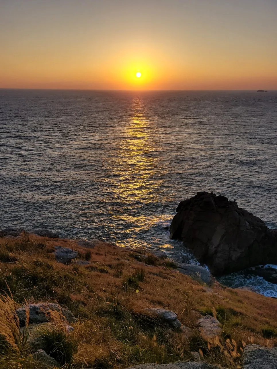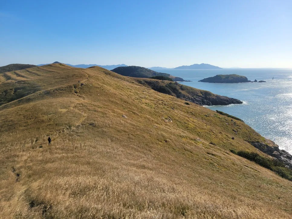 10여 분 울창한 나무 숲을 기어 올라가면 앞이 탁 트인 산등성이에 억새와 강아지풀 중간 정도 느낌의 수크령 들판이 펼쳐진다. 가보지는 못했지만 아일랜드 섬에서나 볼 법한 풍광이라고 한다. 서늘하게 불어오는 바닷 바람을 따라 가르마 같은 굴업도 능선 길을 따라 걷다 보면, 어느새 서해 끝자락 언덕배기에 다다르게 된다. 잠시 숨 고르는 사이 해는 서서히 바다 아래로 내려앉으려고 한다. 티끌 하나 없는 하늘과 햇빛을 머굼고 반짝이며 잔잔하게 일렁이는 물비늘을 바라보고 있노라니, 문득 이곳이 세상 끝임을 자각한다. 우리는 참 멀리도 떠나왔구나. 먼 바다를 뚫어지게 바라보고 있노라니, 다시 갓 태어난 듯 모든 기억들이 사라져 버렸다.