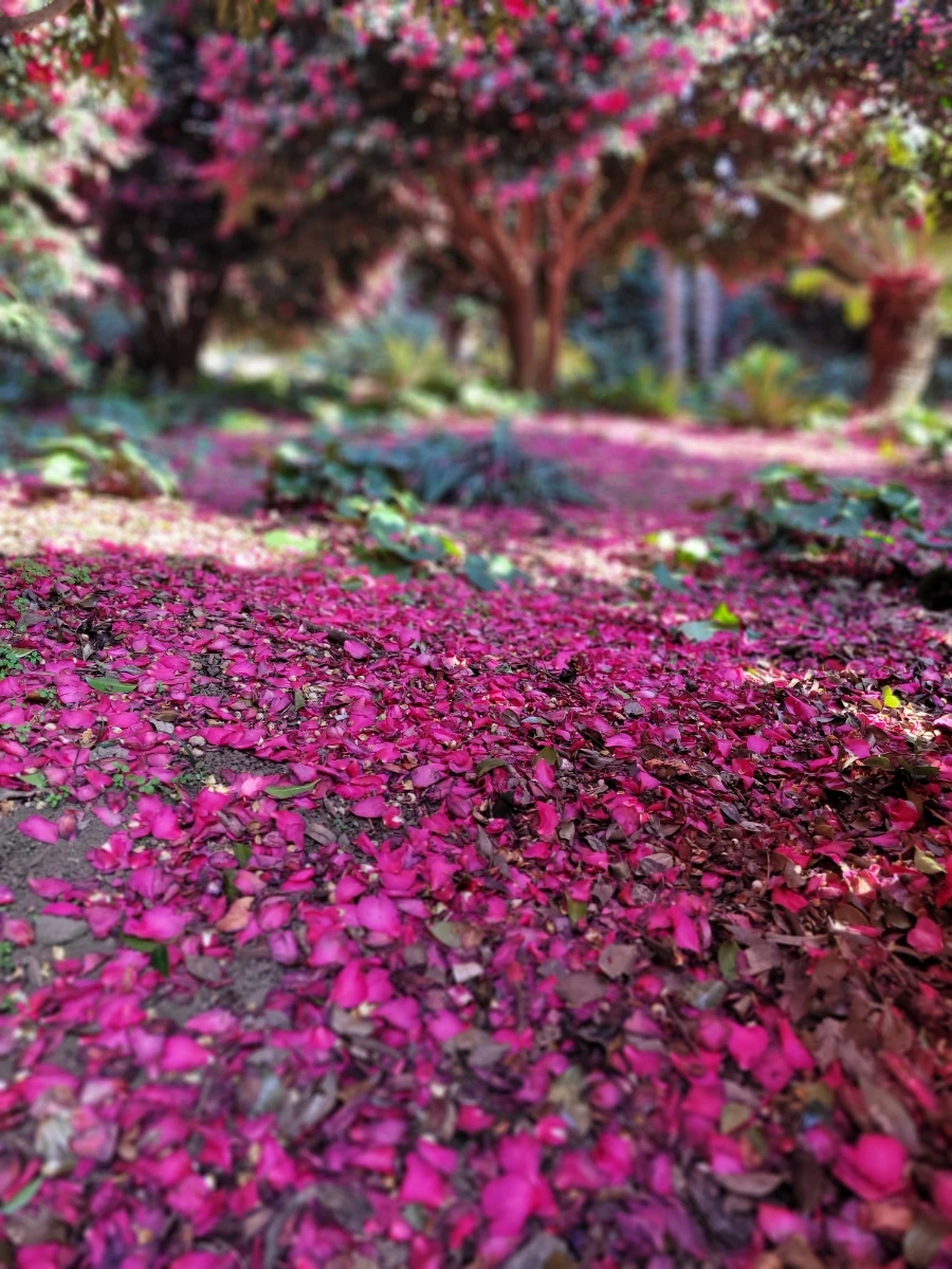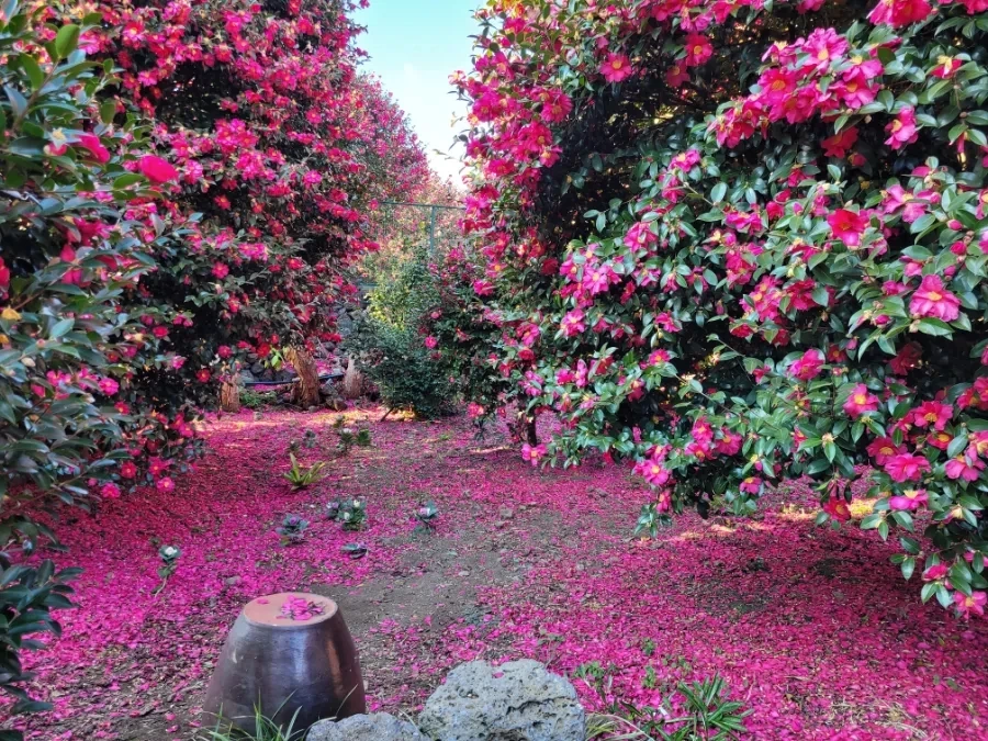 동백나무 아래에는 소복이 쌓인 동백꽃잎들이 붉은 카펫처럼 땅을 뒤덮고 있다. 꽃송이채로 떨어지는 일반 동백꽃과는 달리 애기동백은 꽃잎 하나하나 떨어진다고 한다. 떨어진 꽃잎들은 사라지기 전 마지막 아름다웠던 기억을 간직하고 싶은 듯 자신의 색을 더욱 선명하게 드러내고 있었다.