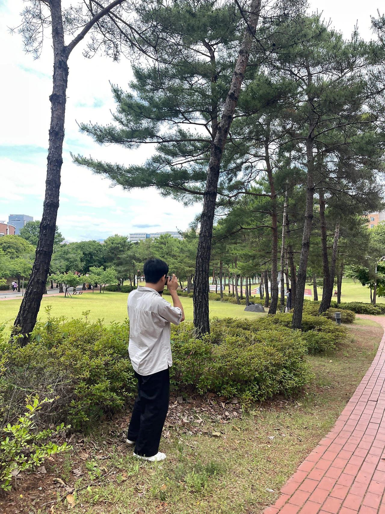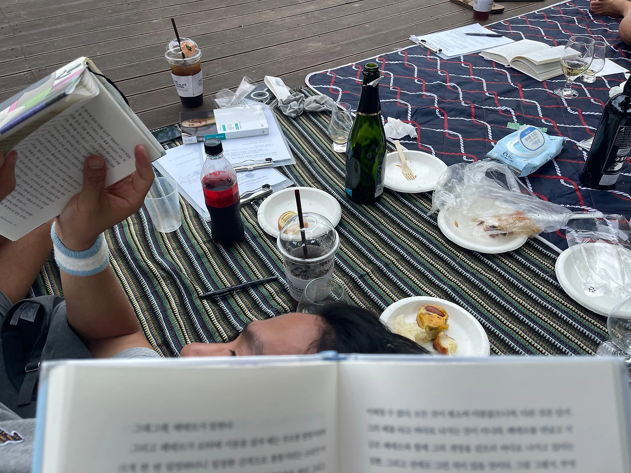 오늘 아침은 저희 북클럽 1회 차부터 참여해 준 고마운 회원님께서 직접 호스팅을 하는 날입니다. 피크닉 장소도 직접 선정하고 커피와 아이스박스, 소시지 계란빵, 돗자리를 야무지게 챙겨 30분 일찍 자리를 맡아두고 기다리고 있습니다. 투박하면서도 통통하고 매끄러운 외관이 귀여운 필름카메라와 잔잔한 노래가 흘러나오는 스피커까지 더해져 더할 나위 없는 피크닉 분위기였습니다.