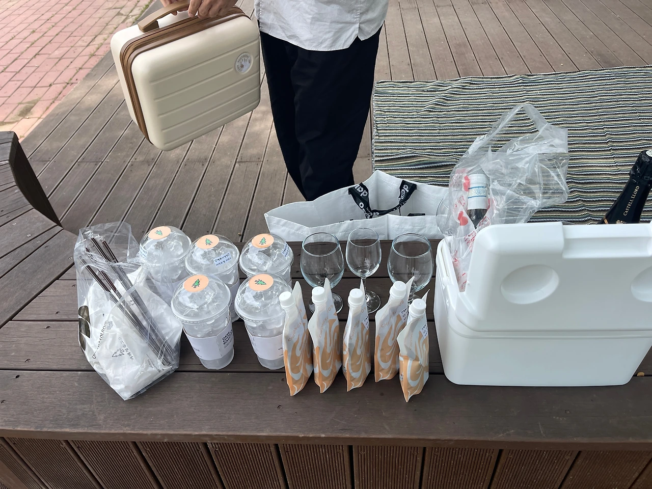 다행히 어제 쏟아지던 비가 그치고 적당한 구름과 바람이 완벽한 날씨입니다. 저와 남자친구는 위스키와 간식, 빵을 준비했습니다. 얼마 전 교보문고 앞에서 파는 장난감 좌판을 지나치지 못하고 사버린 비눗방울 스틱도 챙겼습니다. 다른 일행은 와인 두 병과 쿠키, 넓은 돗자리를 챙겨 왔습니다. 데크 위에서 호시탐탐 음식을 노리는 비둘기들의 경계마저도 귀여울 정도로 완벽한 피크닉이었습니다.