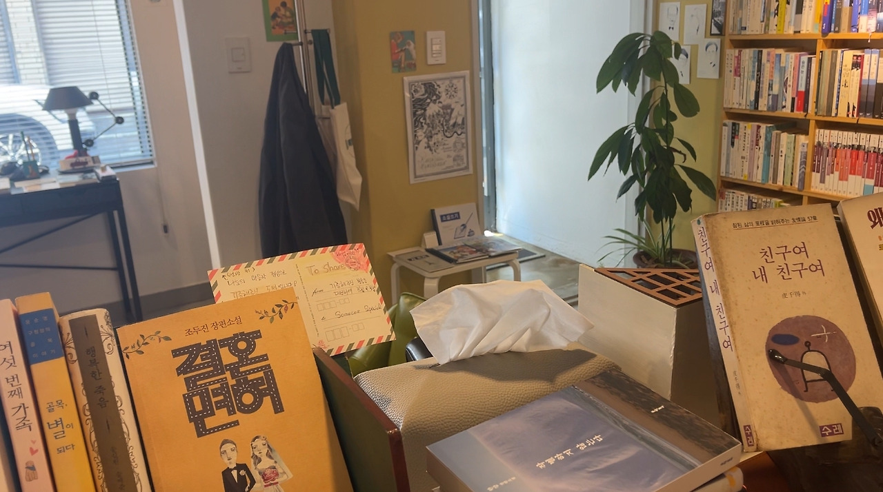 땀을 식히며 책장 끝부터 살피기 시작합니다. 생각보다 좋은 퀄리티에 읽어보고 싶었던 책들이 많았습니다. 읽어본 적이 있는 작가들의 책이나, 들어본 적이 있는 책의 제목들이 우선 눈길을 끕니다. 이것저것 꺼내어 살펴보는 재미가 있습니다. 주위를 둘러보니 다들 책을 고르느라 여념이 없습니다. 한 분은 벌써 서점 의자에 자리를 잡고 앉아 책을 읽기도 하시네요. 저는 두 권의 책을 골랐습니다. 김연수 작가의 <청춘의 문장들+>과 아니 에르노의 <집착>입니다. 오늘의 호스트 분은 무려 세 권을 골랐네요. 계산을 할 때쯤 되자 6명이 나란히 서서 꽤나 긴 줄이 만들어졌습니다. 부부로 보이는 서점 주인 분들께서 한 권 한 권 책을 계산할 때마다 여담을 덧붙여 주십니다. 김연수 작가님을 최근 뵀었다는 이야기를 해주셨고, '집착'은 읽어보지 못한 책이라며 아쉬워하시기도 했습니다. 내 책장에 꽂힐 책을 살 때 '좋은 책이네요'라는 이야기를 들을 수 있다는 건 얼마나 좋은 경험일까요. 대형서점이나 온라인 구매를 했다면 느끼지 못했을 기쁨입니다.