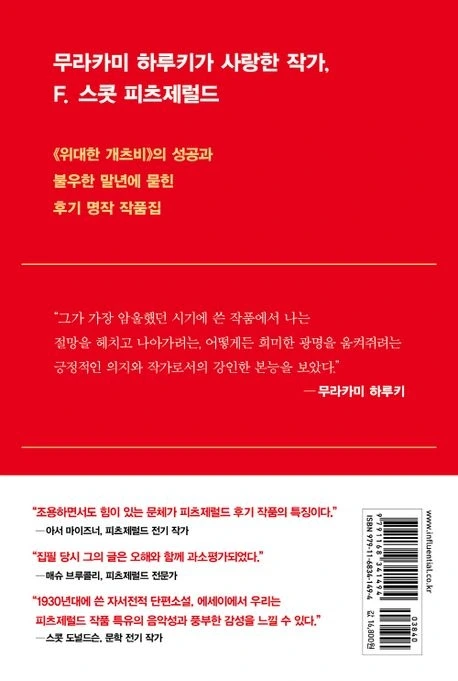 차이점이 있다면 1차 세계대전 이후 미국의 높아진 위상이 향락과 투기를 조장하던 개츠비의 시대와는 다른 배경이라는 점이다. 경제대공황의 검은 구름이 지나간 후, 깜박이는 희미한 불빛의 잔상을 향해 뻗은 손길은 어쩐지 더욱 쓸쓸하고 허무하게만 느껴진다. ’ 알코올에 빠져 ‘, ‘피네건의 빚‘, ’ 잃어버린 10년‘은 닉 캐러웨이와 개츠비의 관계처럼 관찰자의 시점을 따라 펼쳐진다. 그러나 관찰되는 인물들은 개츠비에 비해 살아있다는 느낌을 받기는 힘들었다. 반대로 나머지 글들은 피츠제럴드 자신이라고 보아도 무방할 만큼 너무 생생해 그 숙취에 조금 어지러운 기분이 들 정도였다.