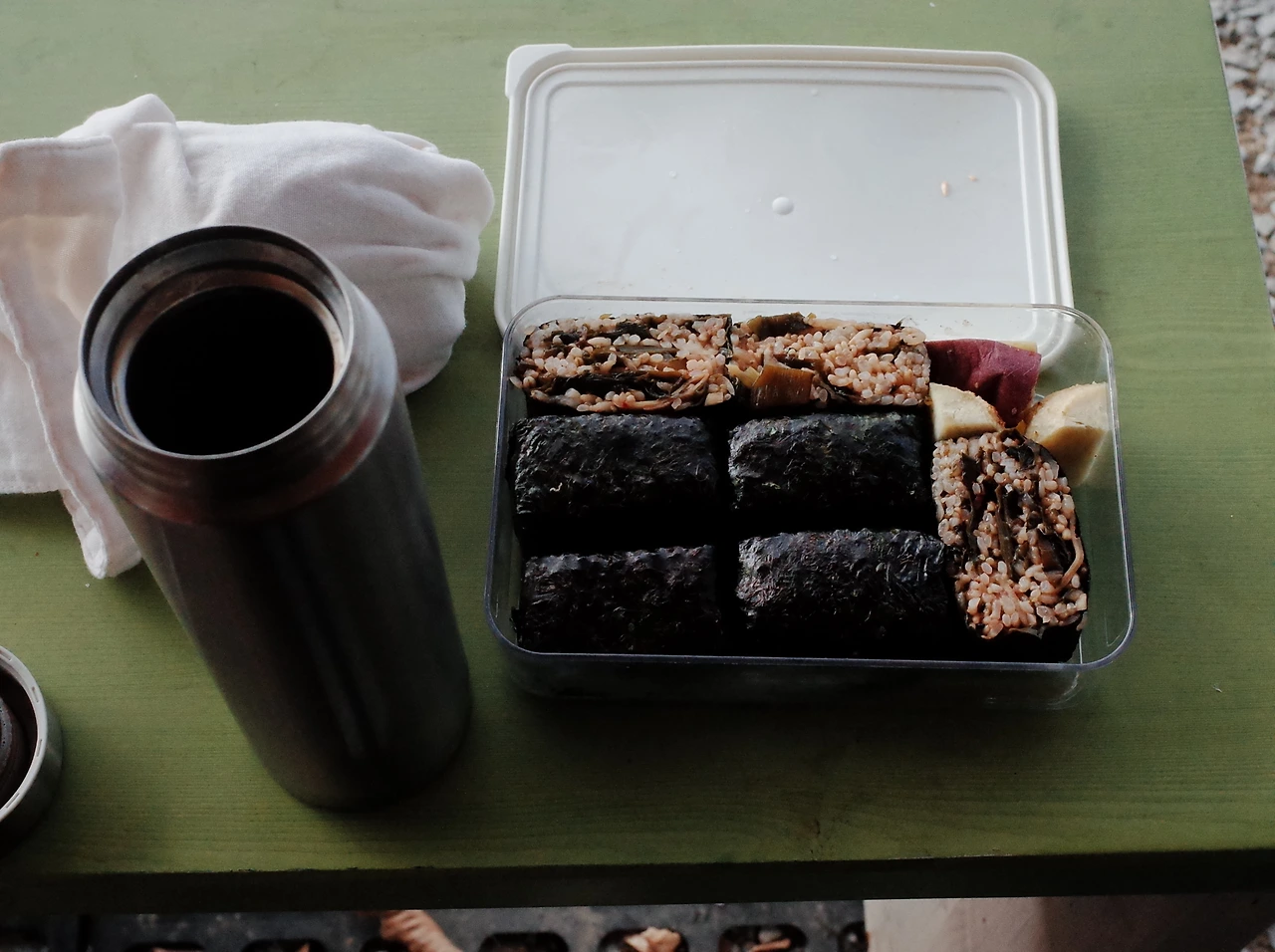 도시락을 챙긴 가방을 메고 볕을 좀 쐬어보겠다는 핑계를 대고 벤치에 앉아 보온병에 담긴 차부터 홀짝입니다. 도시락을 먹기에는 시간이 좀 이른 듯하지만 뚜껑을 살짝 열어 봅니다.
