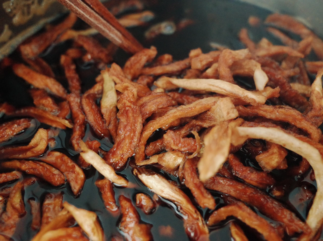 1. 무말랭이를 흐르는 물에 헹구고 조림물이 잠기도록 붓고 한소끔 끓인다.