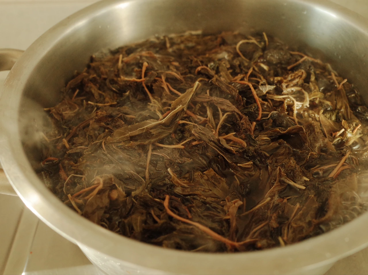 1. 건나물(곤드레, 취나물, 뽕잎, 다래순 등)을 15분간 팔팔 끓이고 그대로 하룻밤을 불린 후 흐르는 물에 헹구고 물기를 꼭 짜낸다.