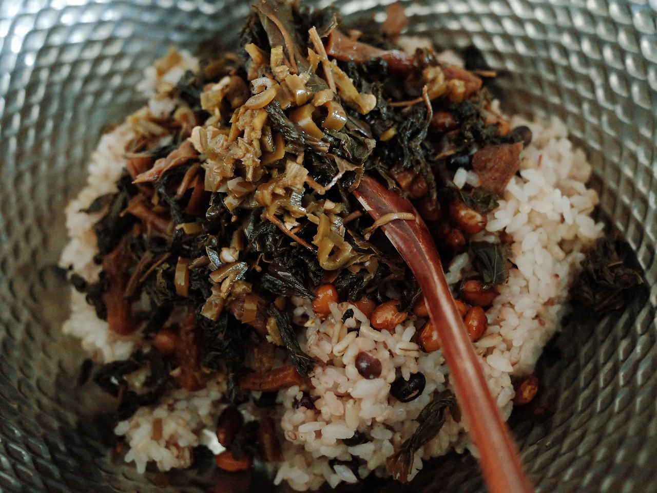 3. 준비한 산나물 초조림, 무말랭이 초조림, 메주콩 조림을 넣고 젓가락으로 섞는다.