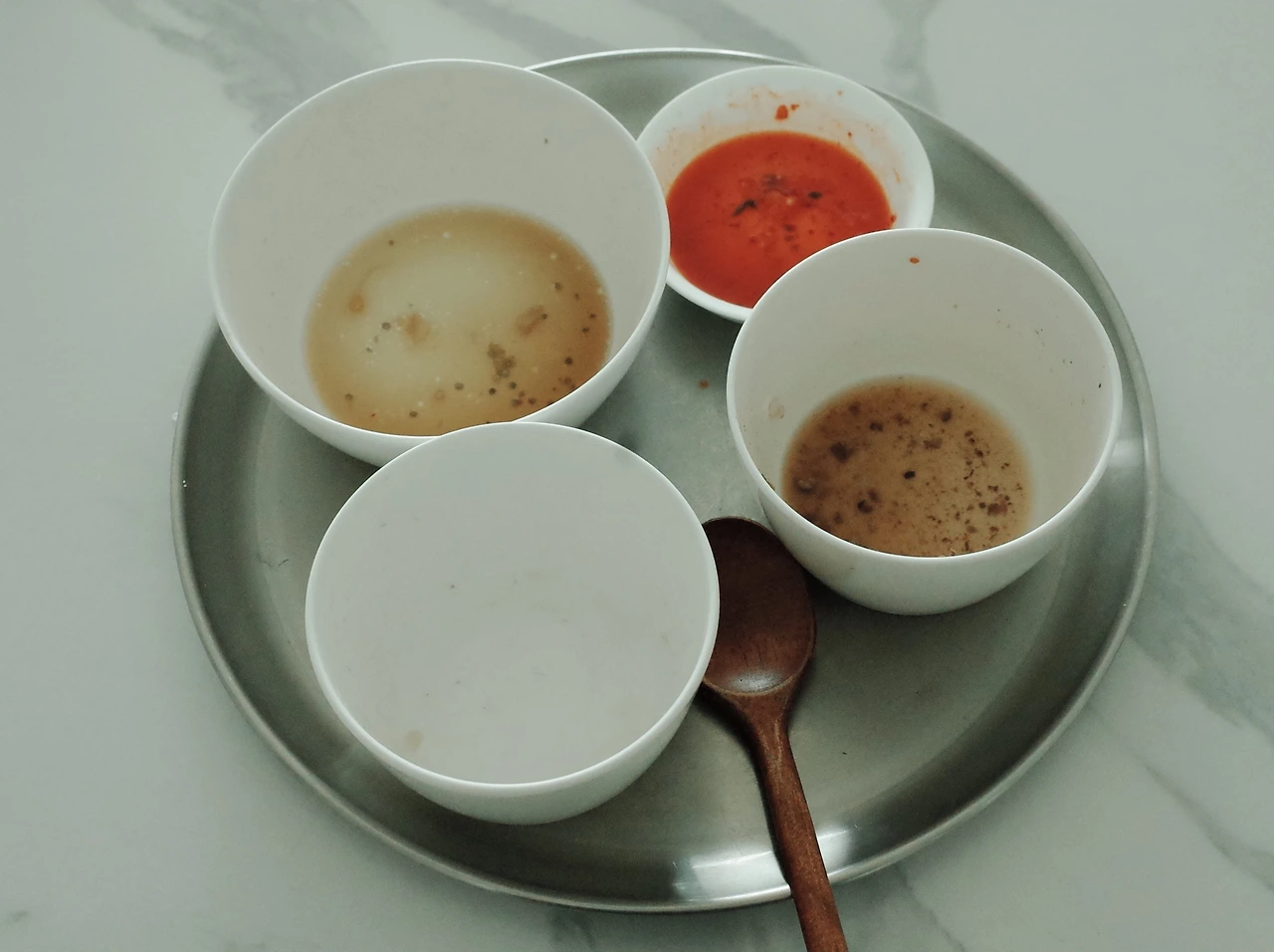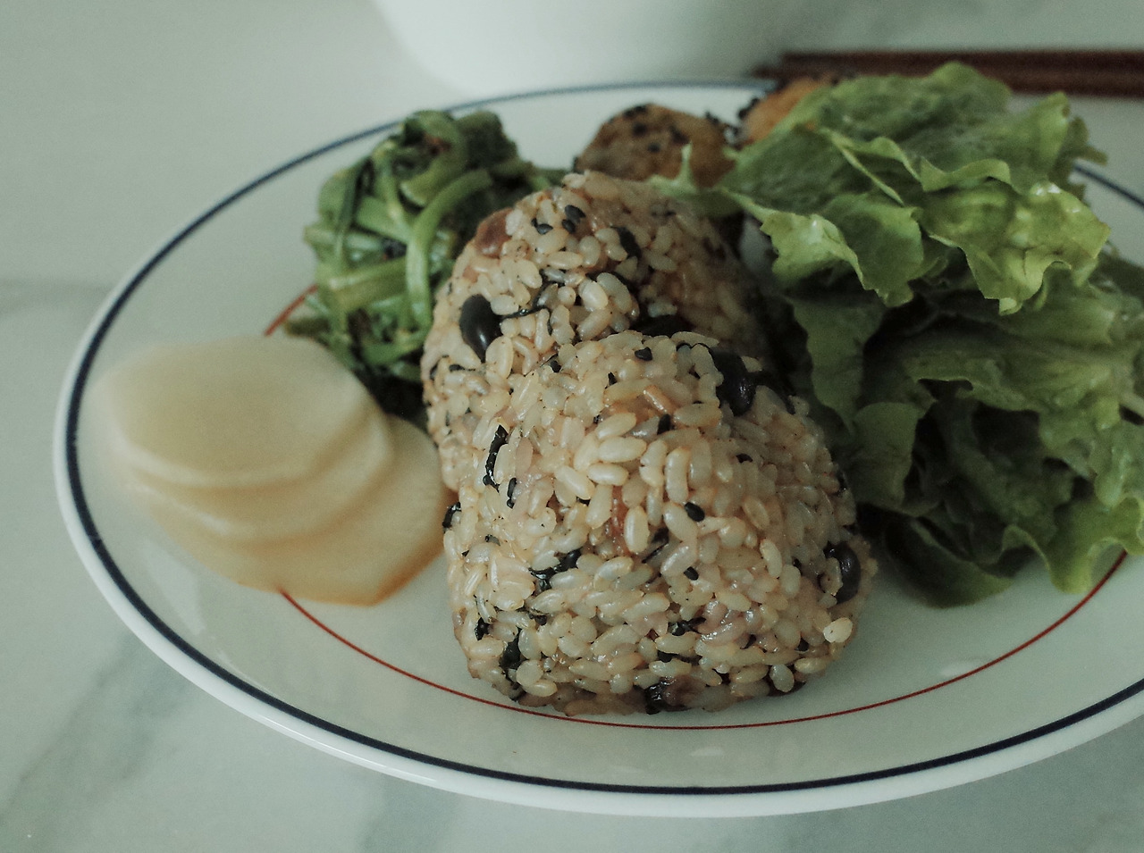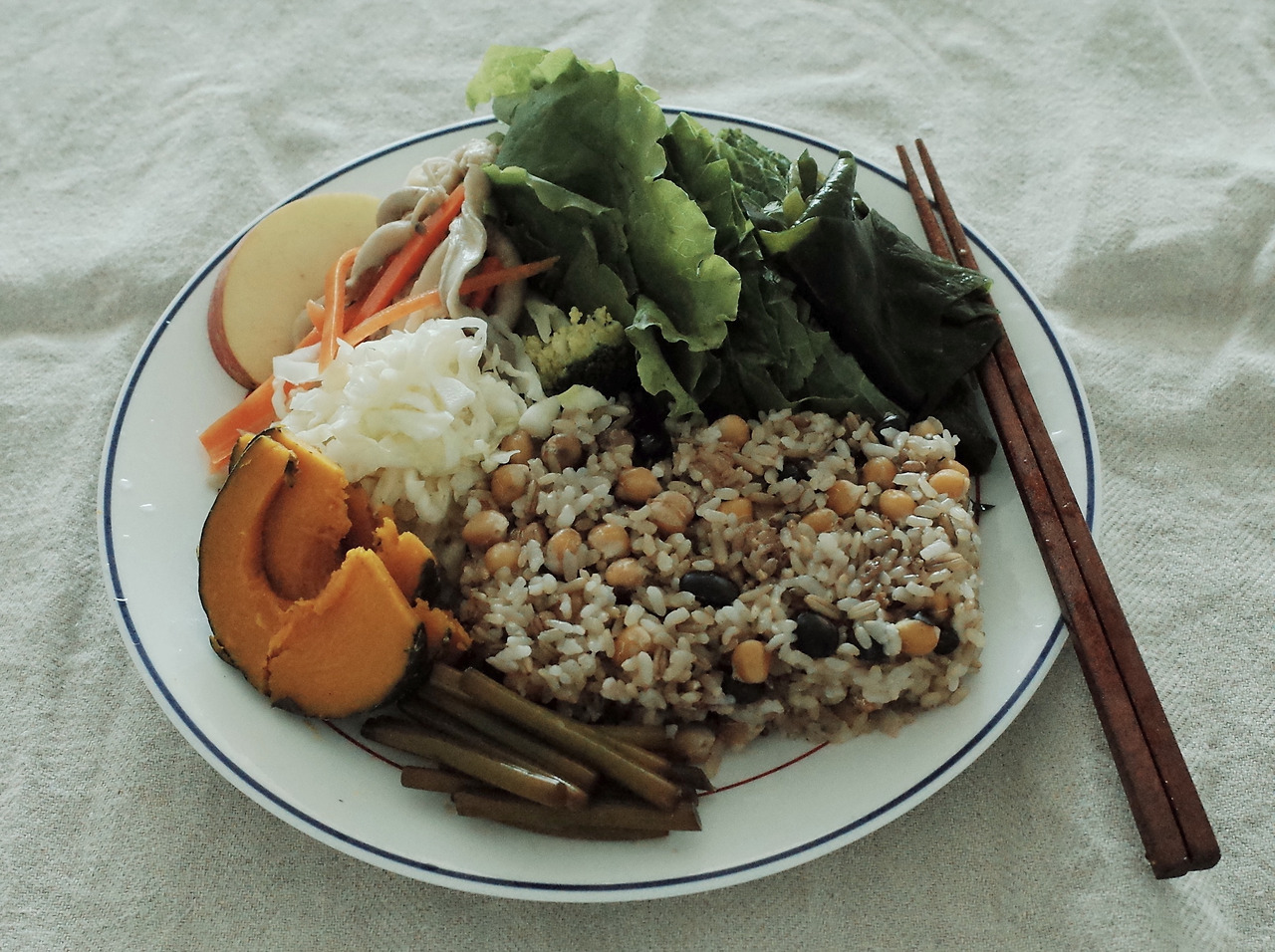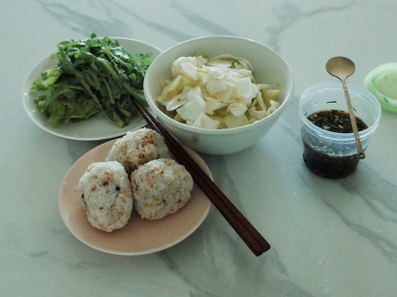 밥 많이 배부르게, 새콤달콤 식욕을 돋우는 채소 반찬, 마음을 녹여주는 달콤한 과일. 심심하지만 내 몸에는 잘 맞아 소화가 잘된다.