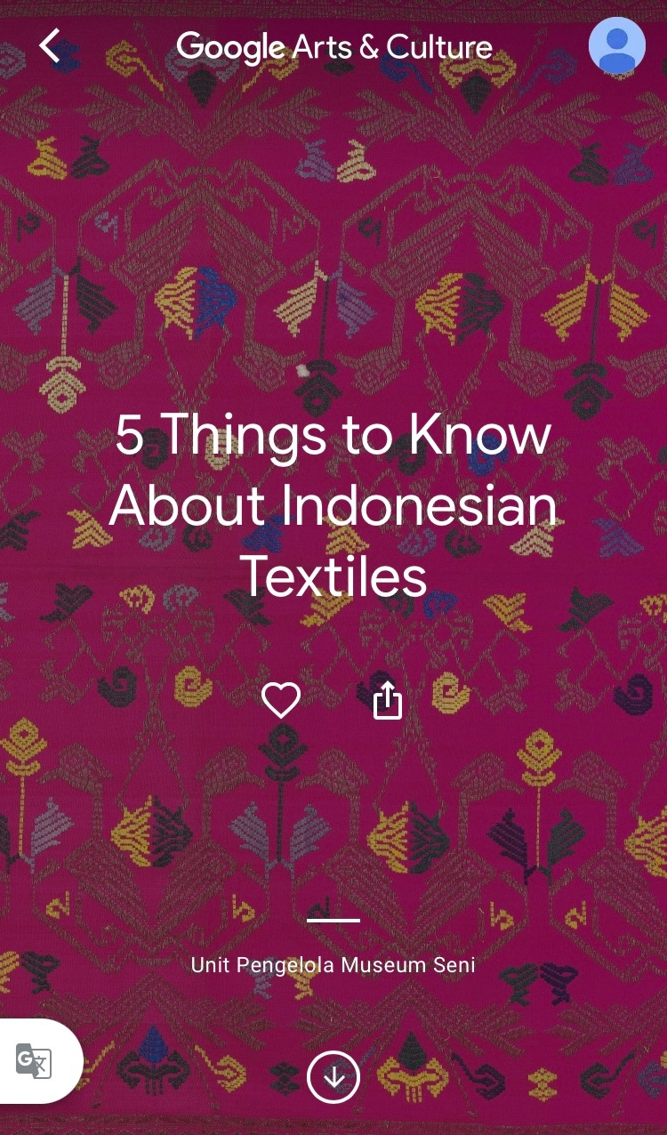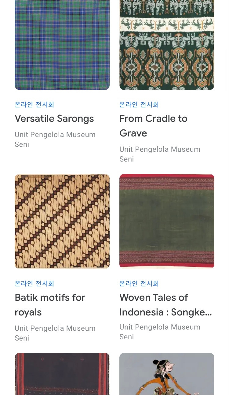 또 각 기관에 따라 소유한 작품들로 컬렉션을 만들어 온라인 전시회를 특별 기획한 곳도 있다. 자카르타에 있는 세 박물관 Fine Art & Ceramic Museum, Textile Museum, Puppet Museum을 선보이는 Unit Pengelola Museum Seni를 통해 인도네시아에서 전통적으로 전해지고 있는 텍스타일의 역사와 기술에 대한 핵심 정보가 정리된 걸 접하게 되었다.