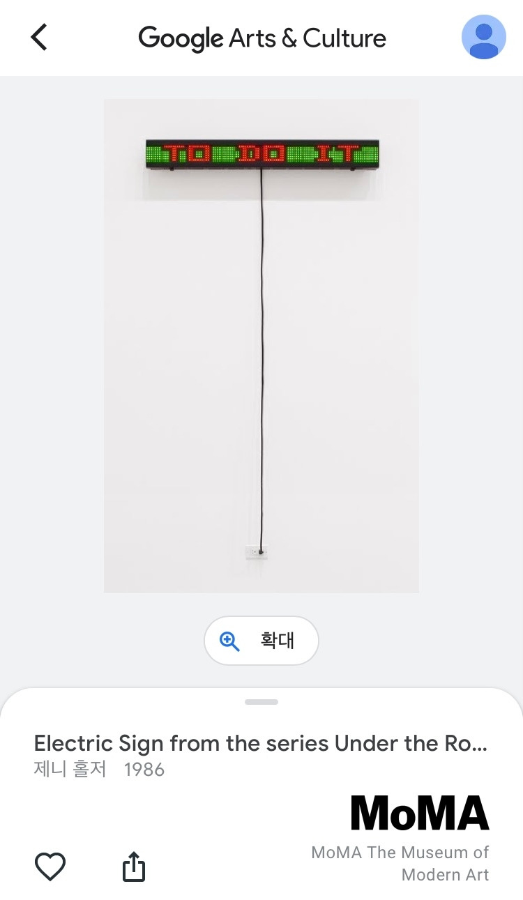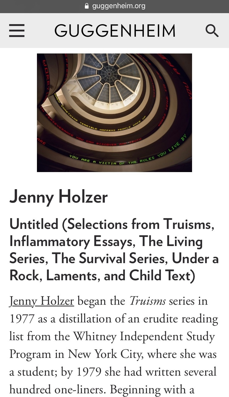 -구겐하임 자료에는 홀저가 어떤 방식으로 상업적 간판을 예술품으로 승화시켰고, 이러한 결과는 사회적 맥락에서 어떤 방향을 나아가고 있는가 간단히 설명되어 있었다.
