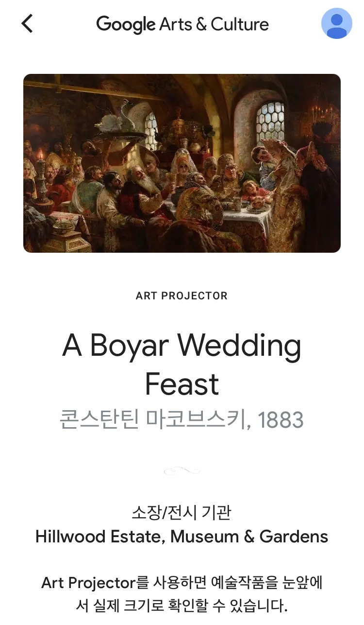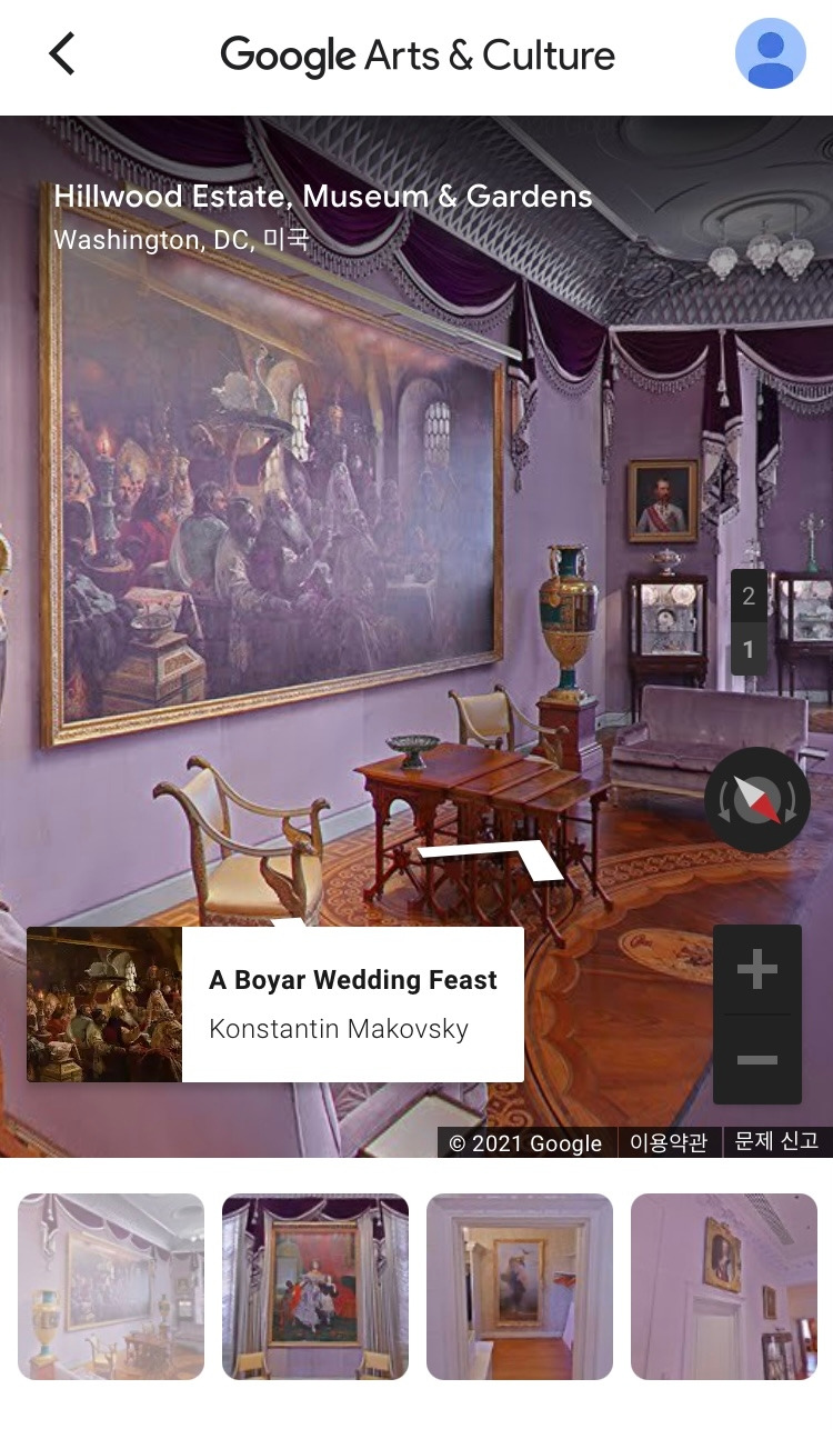 ‘스트리트뷰’ 기능은 작품이 전시 된 실제 공간 속에서 확인 할 수 있게 해준다. 마코브스키의 <A Boyar Wedding Feast> 작품이 Hillwood Estate, Museum & Gardens에 소장 된 모습을 확인하며 뜻밖의 크기와 장식성에 처음 가졌던 첫인상과는 다른 각도로 감상하게 되었다.