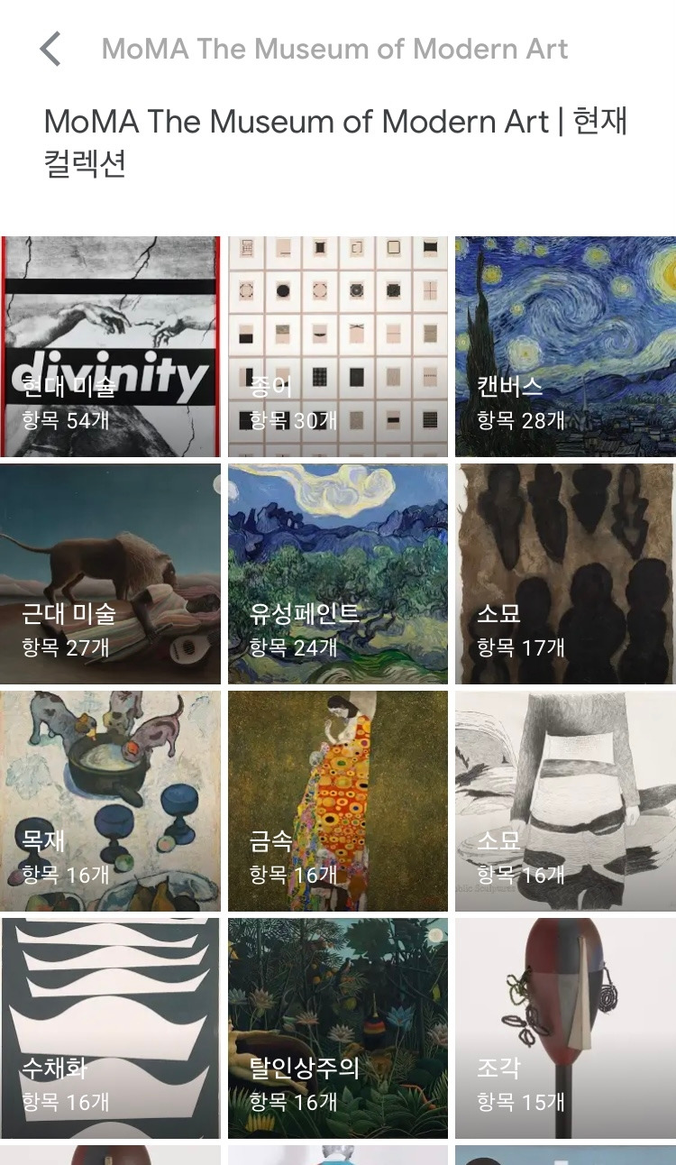 이제 현대미술을 대표하는 뉴욕의 MoMA에 가보기로 한다. 온라인 전시를 위해 작품의 재료나 미술사조 같은 키워드로 작품을 구별해 두었다.