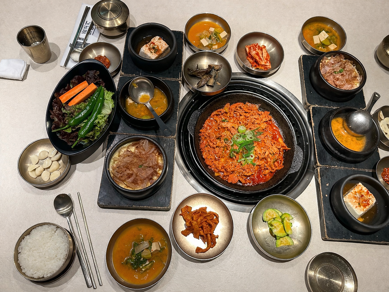 불판 위에 올려진 제육볶음이 지글거리는 소리를 들으며,
