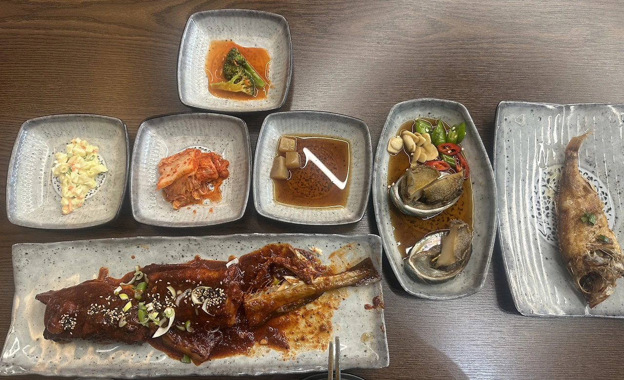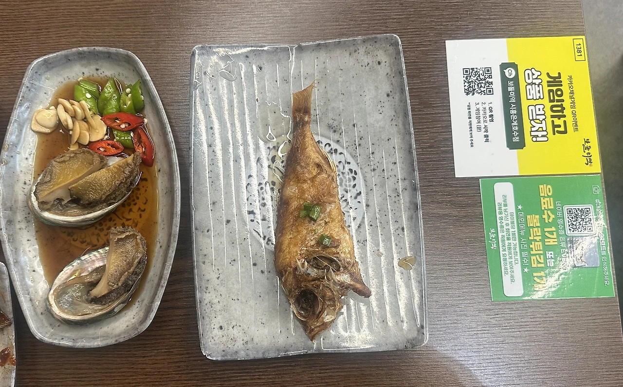 서비스로 제공된 바싹한 볼락튀김과 전복간장조림도