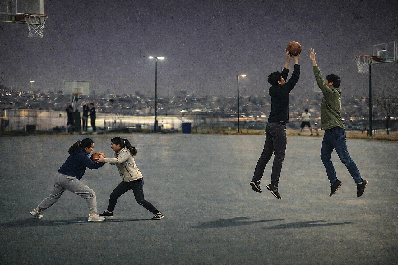 한강공원 농구 코트에는 몇몇 젊은이들이 공을 튀기고
