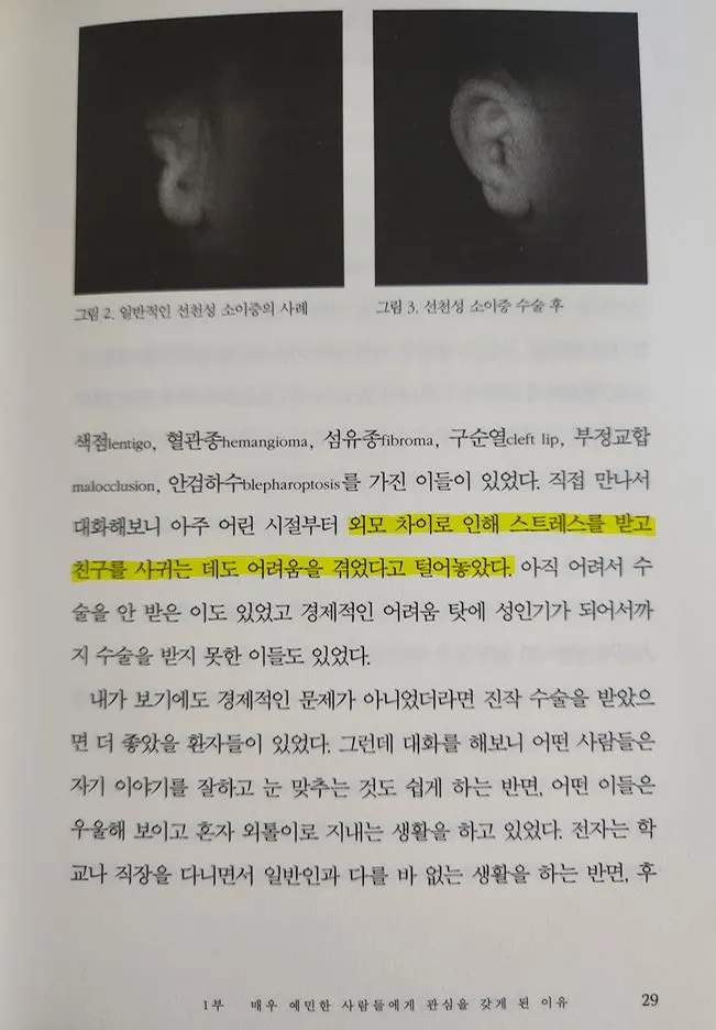 책을 읽으며, 저에게 특히 인상 깊었던 부분은 28p의 '안면 기형과 어린 시절의 트라우마' 챕터였습니다. 저는 얼굴에 혈관종(화염상모반)이 있어, 우울증과 대인기피증을 겪었던 터라, 이 챕터의 내용은 저에게 큰 위로가 되었습니다. 선천적인 안면 기형이 있는 사람들은 다른 사람들에 비해 스트레스를 많이 받고 친구를 사귀는 데 어려움을 겪는 경우가 많다고 합니다. 또한 기형을 가리고 살아갈 경우 기형이 드러나지 않을까 하는 걱정 때문에 예민하고 날카로운 성격, 우울증, 트라우마 등 만성적이고 부정적인 자아상을 가지게 되는 경우가 많다고 합니다.