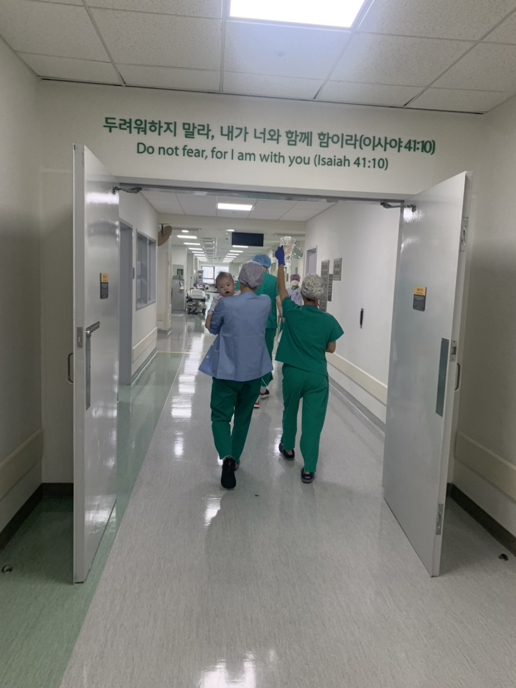 시온이가 간호사에게 안겨 수술실 안으로 들어간다.