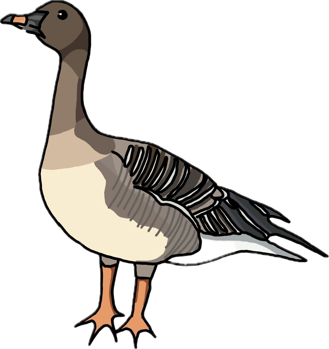 가지고 있고 꽁지덮깃(엉덩이?)은 하얀색이야. 부리는 검은색인데 끝부분에 등황색의 띠가 있지. 덩치가 큰 편인데 다리는 짧아. 그 짧은 다리에 주황색 부츠를 신고 있어.