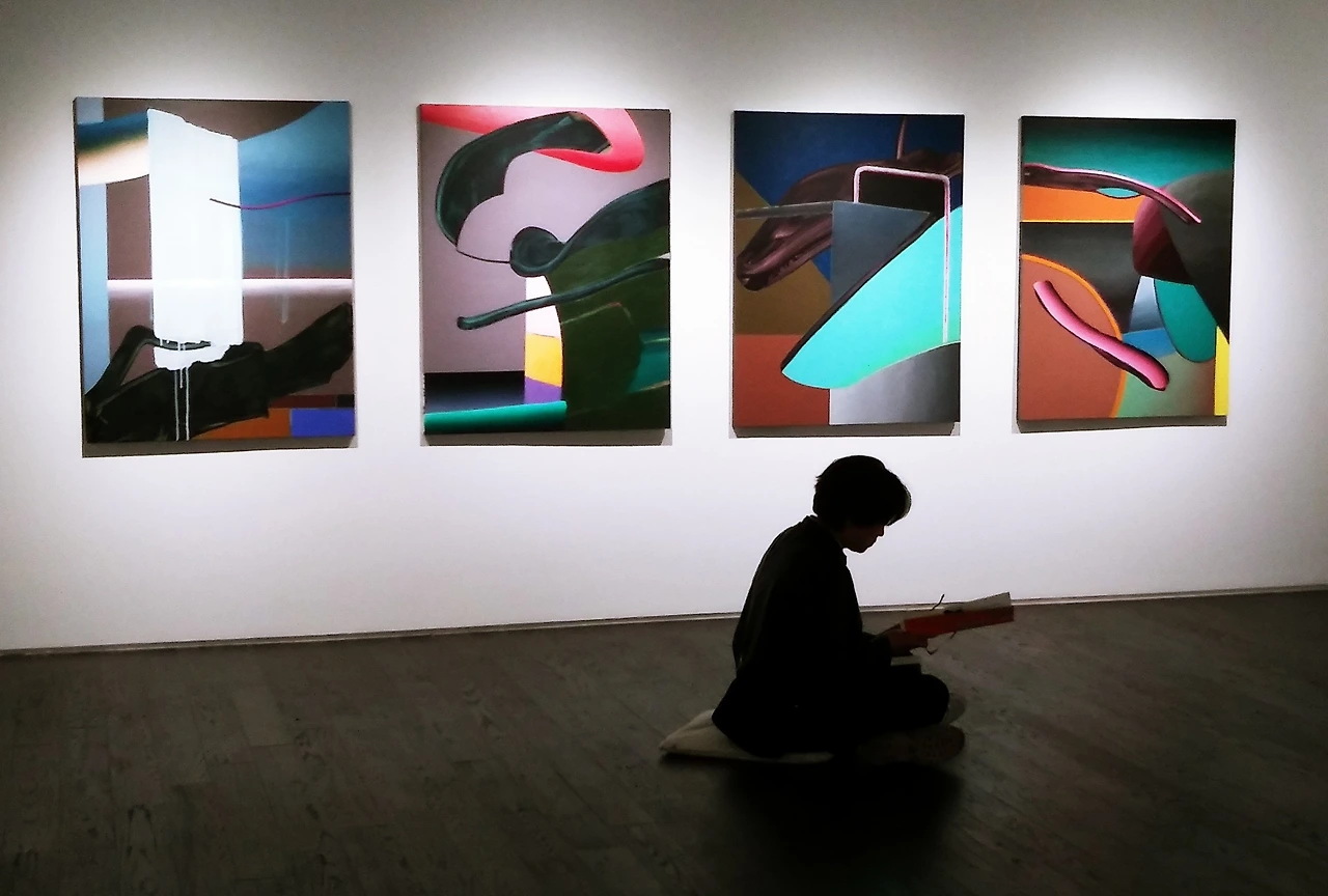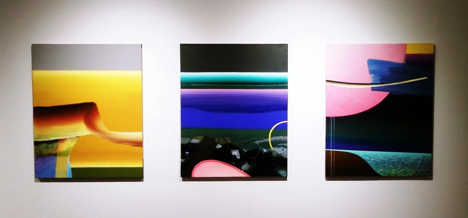 다음으로 관심을 끌었던 작가는 김경한. 이 역시 추상화였는데 방석이 놓인 전시실부터 인상적이었다. 앉아서 보라는 걸 테지, 싶어 털썩 주저앉아 그림을 바라봤다. 그렇게 앉아서 그림을 보고 있자니 원색의 붓 터치로 만들어낸 공간이 묘하게도 자연 풍경으로 다가왔다. 우선 바다가 보였다. 그다음으로 수평선과 노을이 보이고 해와 잔물결도 보였다.