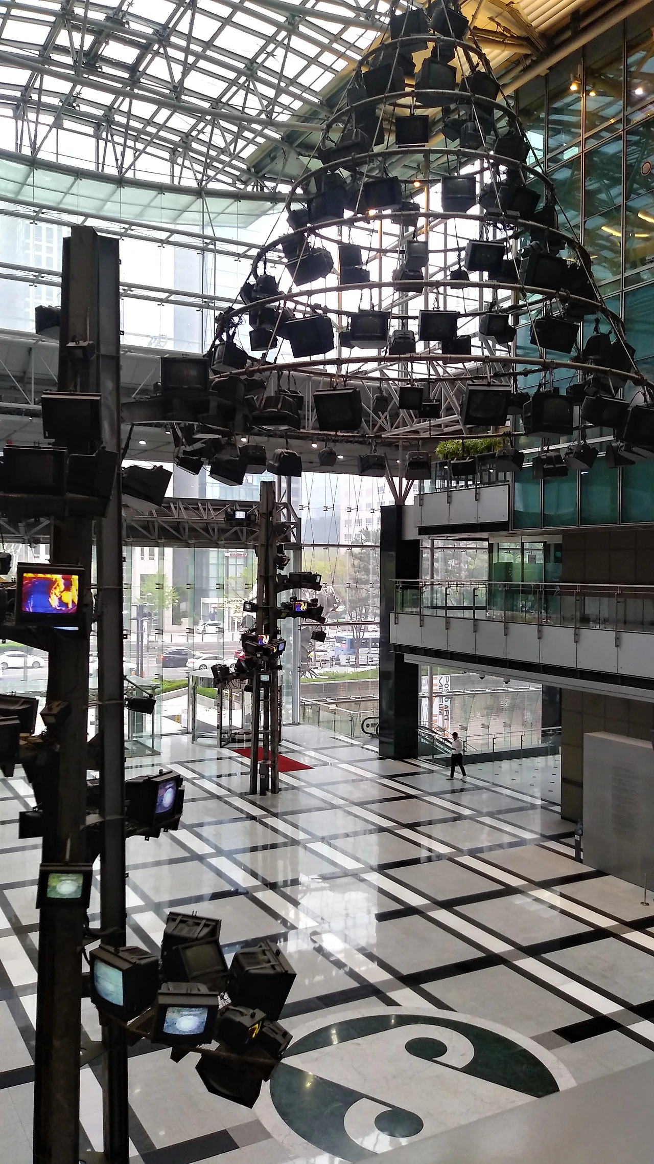 작품을 감상 후 회전문을 통과해 로비에 들어서면 백남준의 작품 <철이철철: TV깔때기, TV나무>와 크기가 2개 층에 달하는 거대한 수족관이 눈길을 사로잡는다.