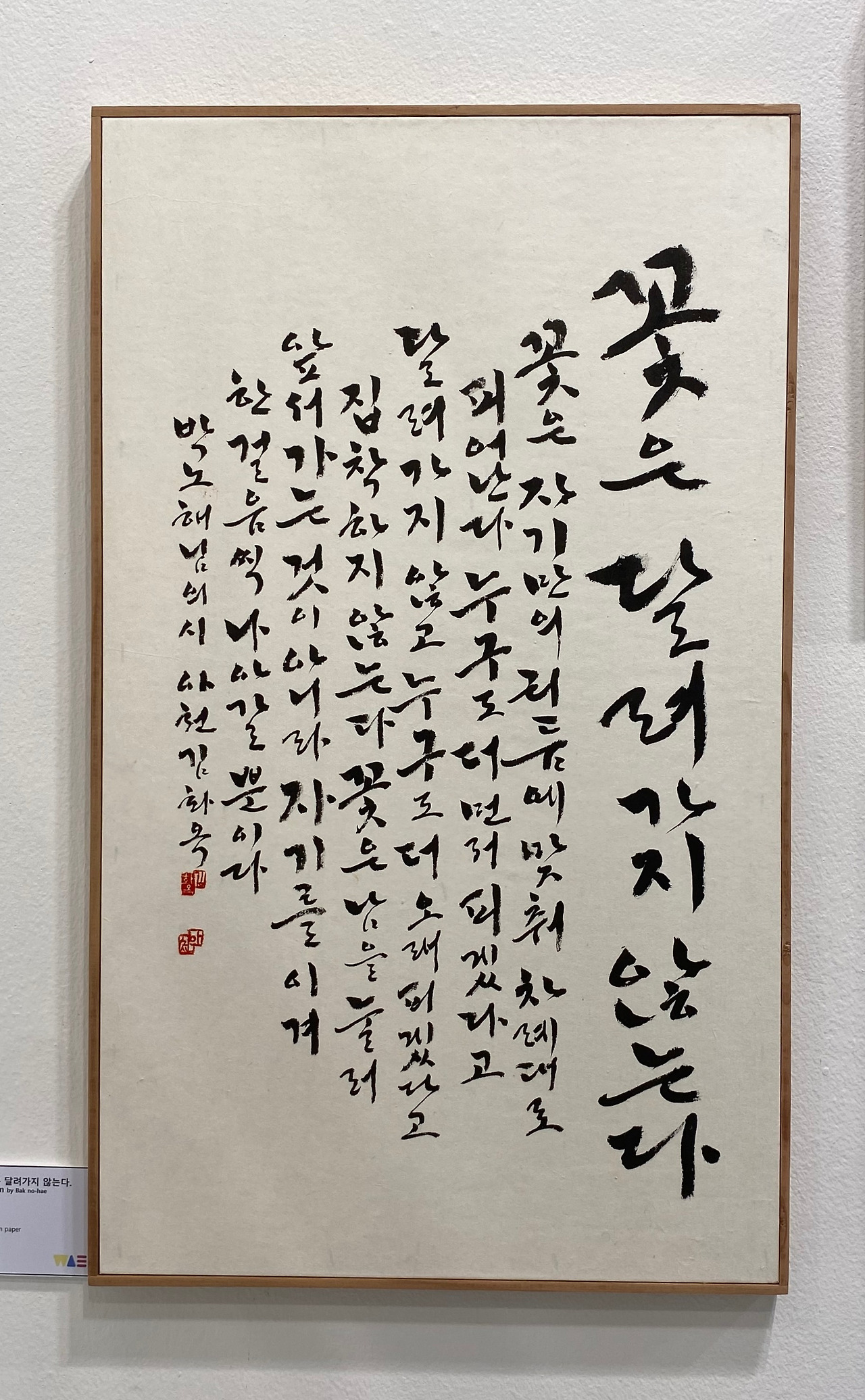지난 주말, 동서와 함께 코엑스를 방문했다. 동서가 보고 싶어 하는 전시가 있어서였다. 전시명은 '월드아트엑스포'. 국내 화랑들이 소유한 그림을 둘러보고 구매할 수 있는 전시였는데 우리가 그곳을 찾은 이유는 그림 재테크를 위해서가 아니라 그곳에 출품된 캘리를 구경하기 위해서였다.