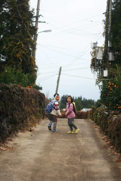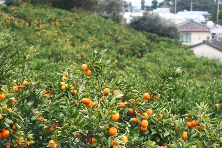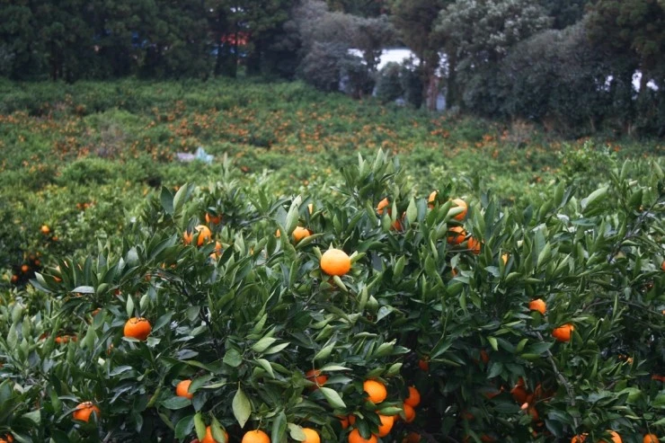 잿빛 하늘 아래 귤밭은 마치 노란 꼬마전구에 불이 들어온 듯 반짝인다.