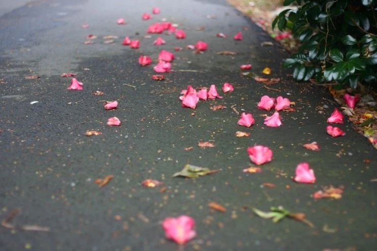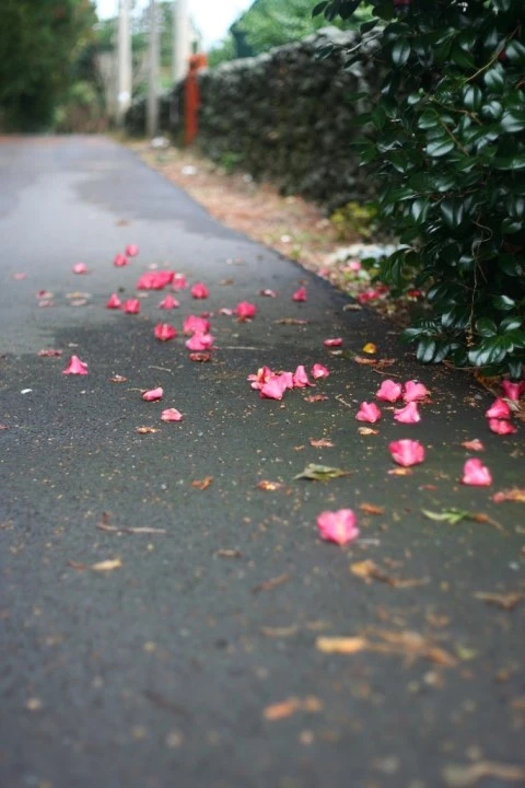 떨어질 때도 가지에 달려 있을 때 모습 그대로 꽃송이째 우아하게 떨어진다.