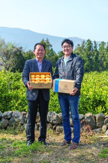 아일랜드박스와 위미농협 유통센터가 협업하는 방식은 이렇다. 레드향, 천혜향 등 귤 주요 품종 출하 시기에 맞춰 아일랜드 박스는 온라인에서 사전 구매자를 모집한다. 위미농협 유통센터는 당도와 산도 등 객관적 데이터와 농장 실적을 기준으로 우수 품질 농장을 선별한다. 아일랜드 박스의 박용순, 전진호 대표, 위미농협 유통센터의 전문가들이 함께 우수 농장에서 재배한 과일 맛을 평가하고 최종적으로 박스에 담을 농장을 선정한다. 선정된 농장의 과일을 아일랜드박스에서 직접 제작한 패키지로 정성스럽게 포장해 고객에게 전달한다.