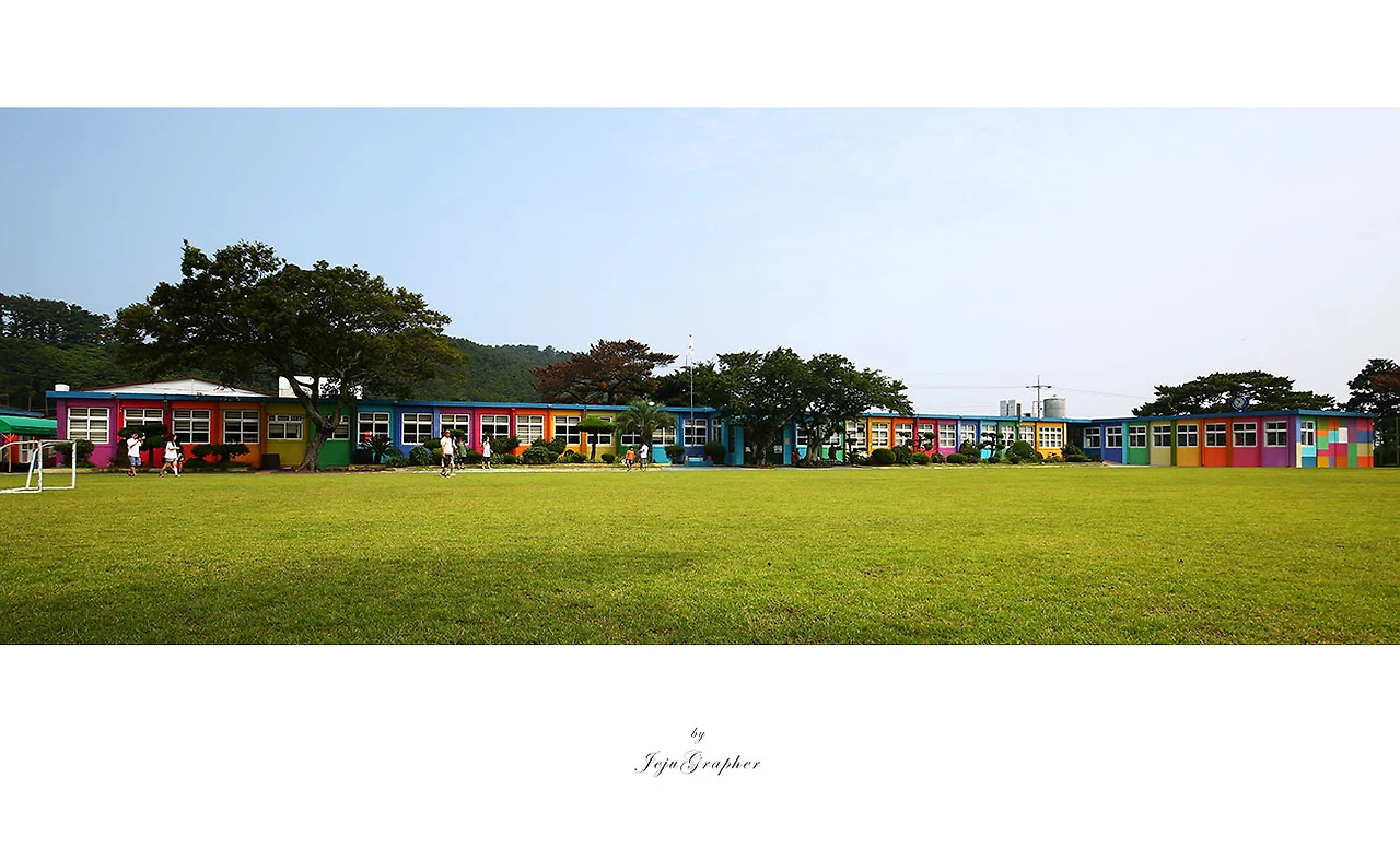 먼저 소개할 곳은 애월 하가리에 있는 더럭분교입니다. 이미 잘 알려진 곳이고 최근 주변에 카페 등의 위락시설도 많이 들어서고 있습니다. (그런 시설의 증가가 그냥 긍정적이지만은 않습니다.) 더럭분교는 그저 시골의 작은 분교였지만 삼성에서 갤노트 광고를 찍기 위해서 학교 전역을 총천연색으로 칠해진 이후로 유명해졌습니다. 그래서 더럭분교라는 이름보다 아몰레드학교로 오히려 더 알려졌기도 합니다. 시작이 대기업의 자본이었다는 점이 마음에 들지 않지만, 이후에 시골의 작은 분교와 주변 마을이 활기를 띄기 시작했다는 점은 다소 위안이 됩니다.