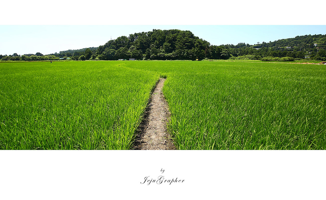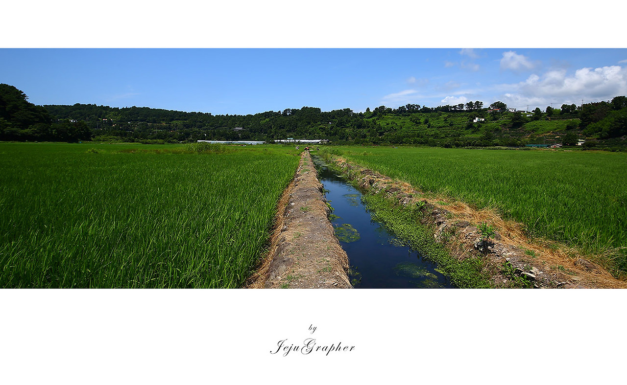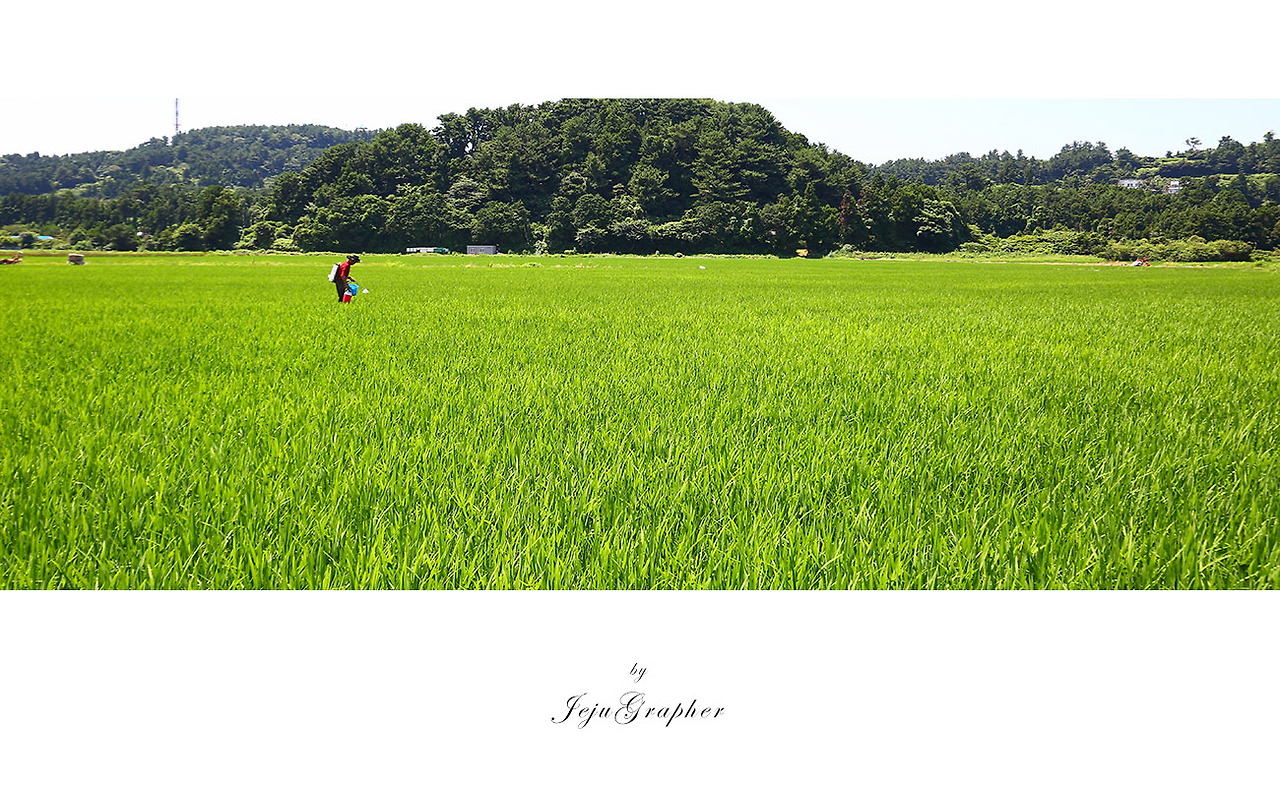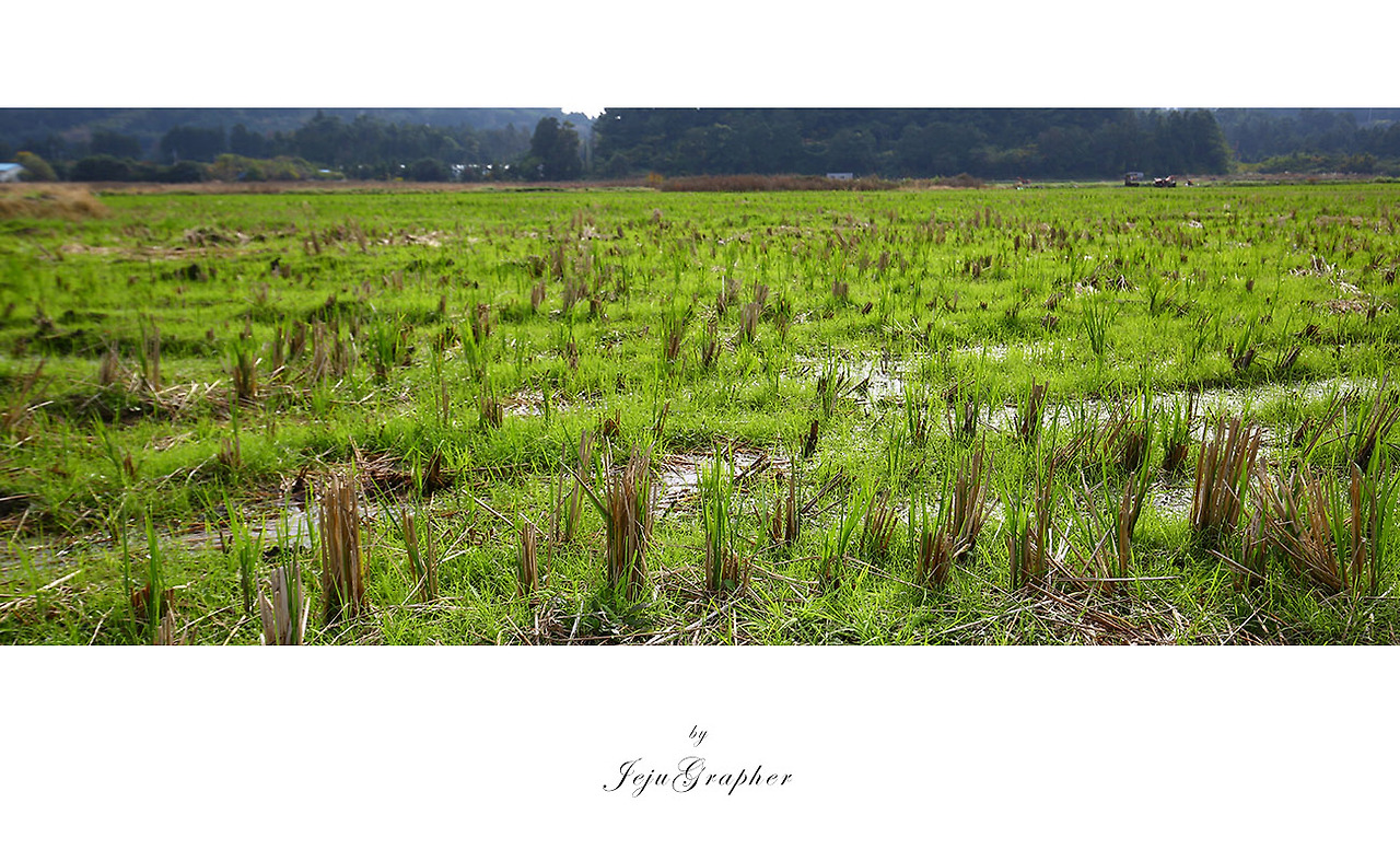 ...라는 것이 그냥 상식처럼 내 머리 속에 깊이 자리 잡고 있었다. 구좌 당근, 우도 땅콩, 메밀, 보리, 귤 등 제주에서 유명한 농산물은 모두 밭에서 자라는 것들이다. 그런데 제주에도 논이 있다는 소리를 들었을 때는 의아했다. 제주의 서쪽 지역을 여행하다 보면 벼가 자라는 풍경을 볼 수는 있다. 그런데 그건 물이 가득한 논에서 벼를 키우는 게 아니라, 마른 밭에서 밭벼를 키우는 거다. 어디에 논이 있다는 걸까? 그런데 의외로 서귀포에서 자주 지나다녔던 길 옆으로 논이 있었다. 단지 내가 그 안쪽으로 들어가 보지 않았을 뿐이다.