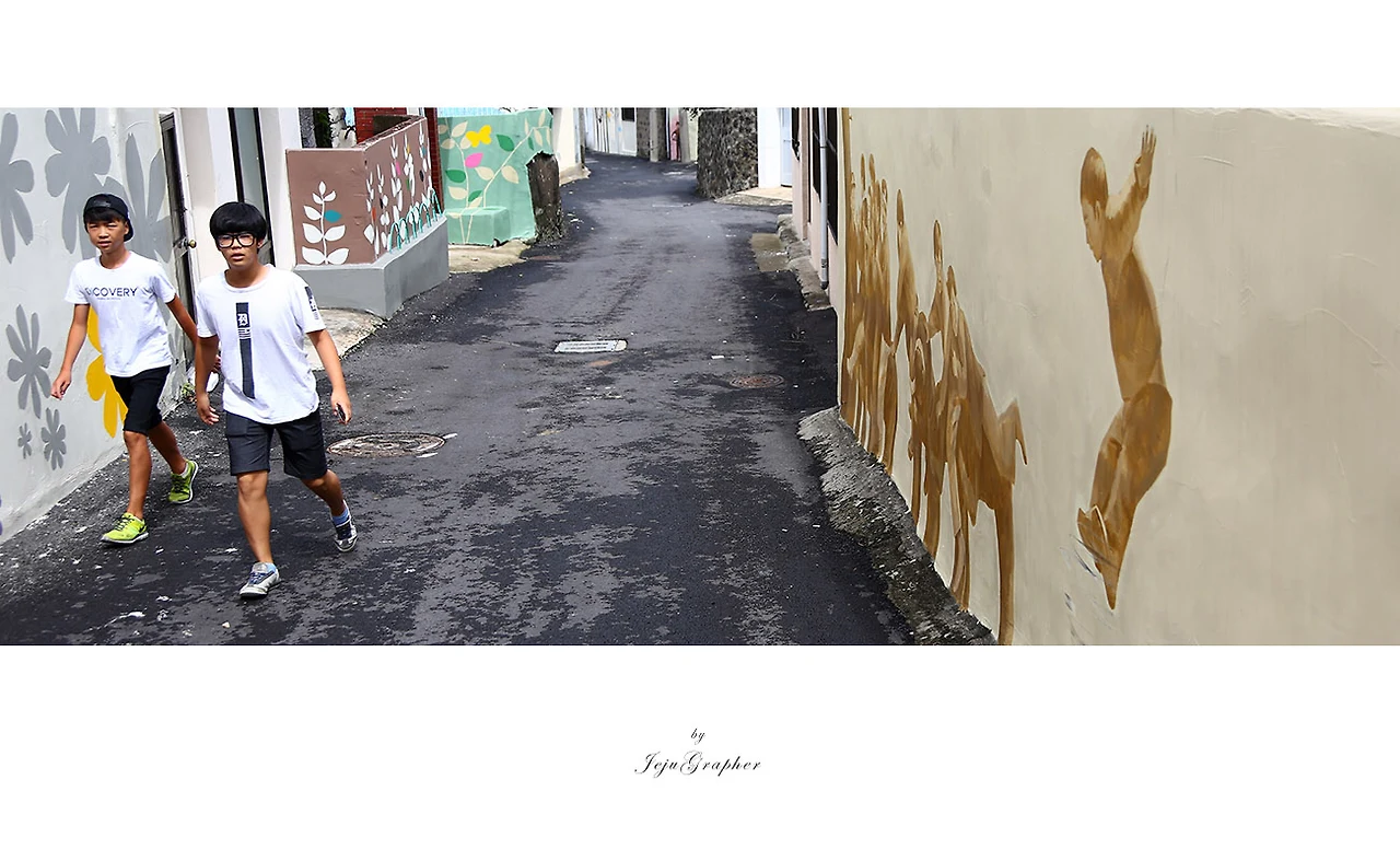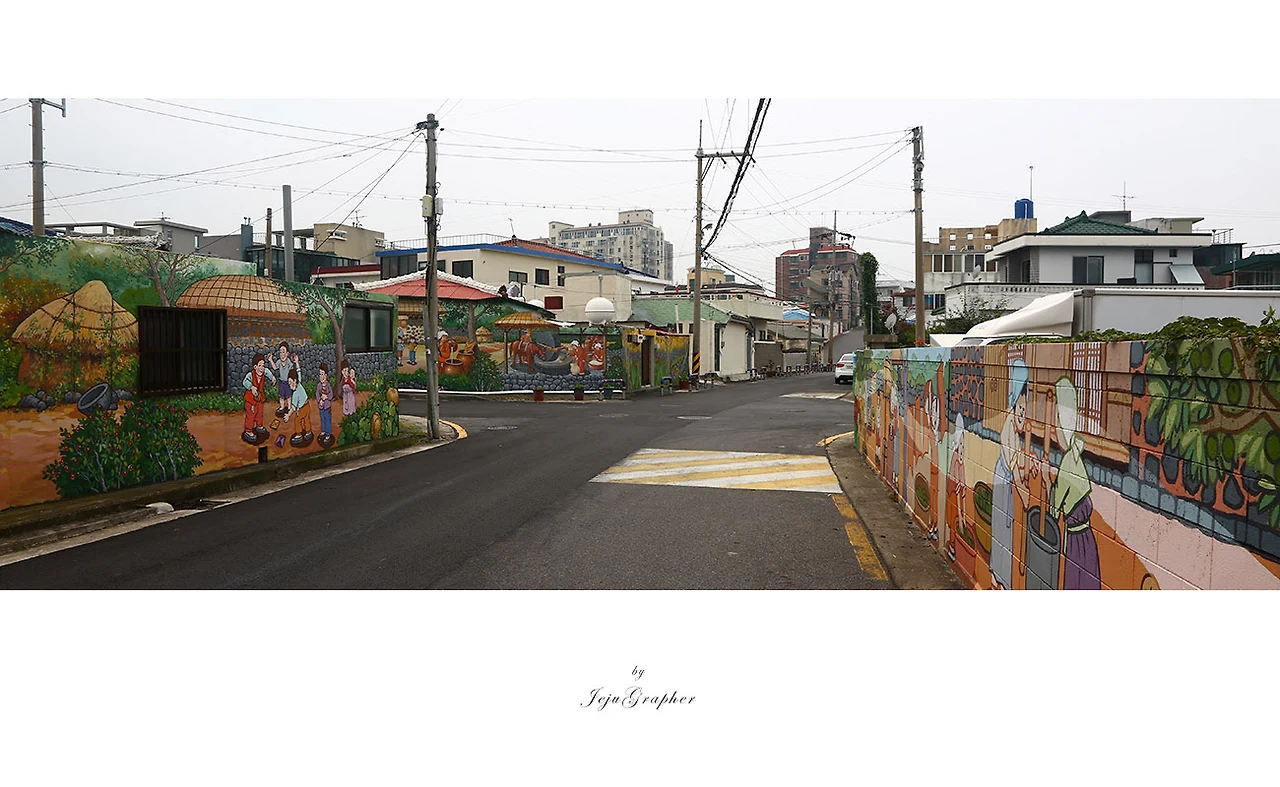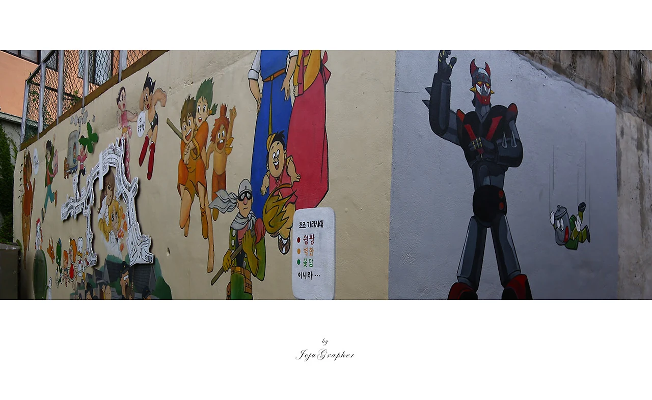 제주도에 두맹이골목에만 벽화가 있는 것은 아닙니다. 탑동 근처에 무근성길은 오래전 제주의 모습을 벽화로 그려뒀습니다. 그리고 아라동 나우리마트 뒤쪽으로 동화 속 장면을 그려둔 벽화거리도 있습니다. 그 외에도 여러 곳에 벽화거리가 있는데 모두 찾아다니면서 사진을 찍어보는 것도 제주에서 즐기는 테마여행이 될 수도 있습니다. 노트북의 디스크를 정리하느라 무근성길과 아라동의 벽화 사진들은 (백업 후에) 대부분 지워버렸습니다. 아래 무근성길 한 장을 제외하고 모든 사진을 지워버려서 다른 사진들은 생략합니다.