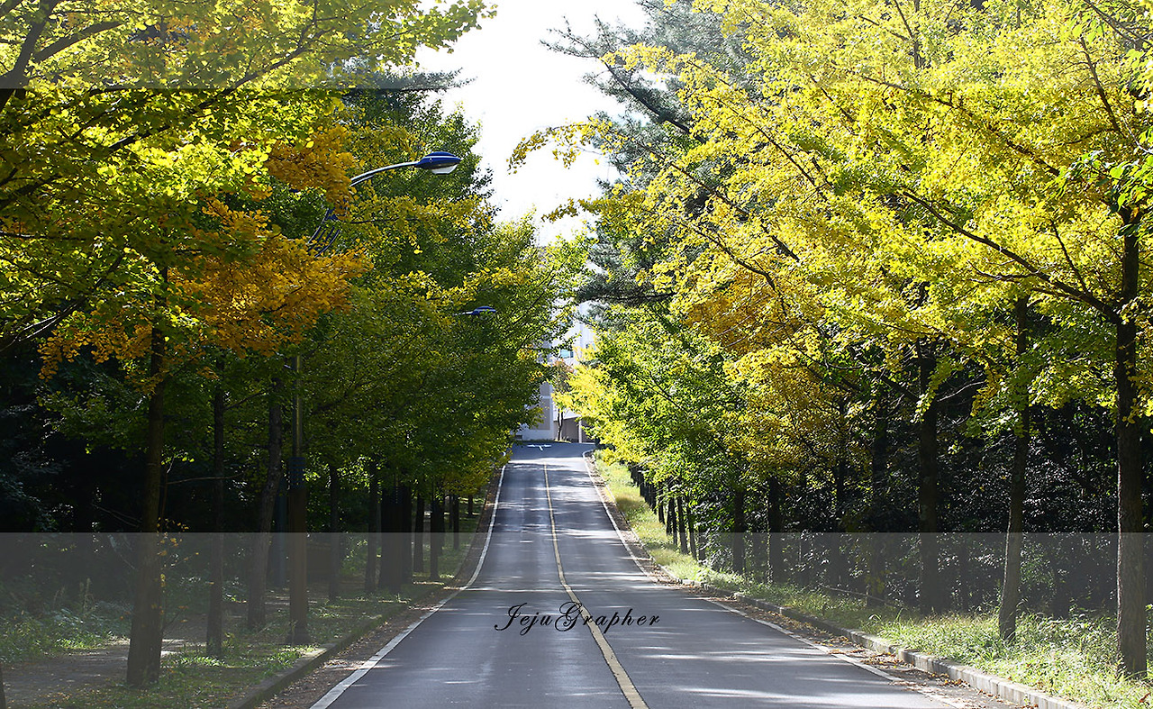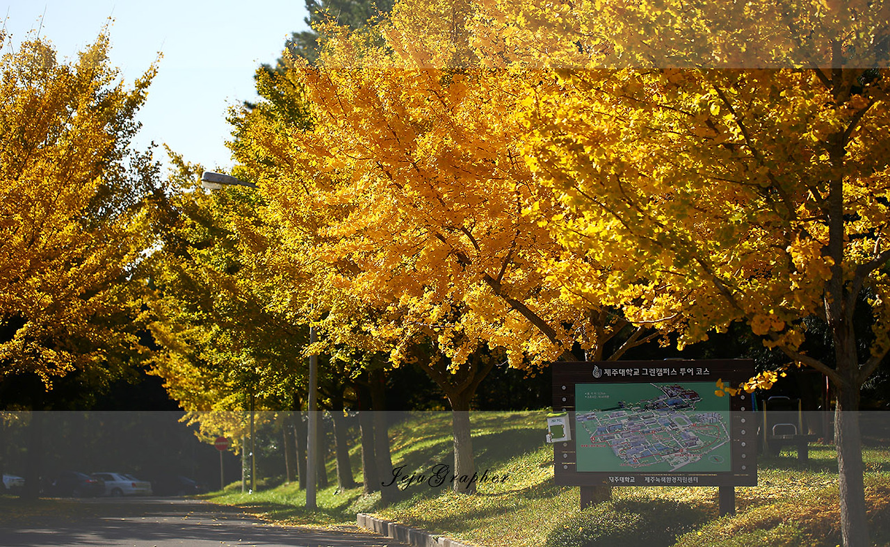 바로 위의 사진을 찍을 때 비가 와서 제대로 다양한 컷을 찍지 못해서 수요일 하루 휴가를 냈는데, 이미 단풍잎은 거의 다 땅에 떨어져서 말라버렸다. 이럴 줄 알았으면 하루이틀 전에 휴가를 냈어야 했는데... 대신 제대아파트로 들어가는 은행나무 가로수길로 갔습니다. (위에 사진 있음) 몇 그루는 색이 노랗게 물들었지만 그렇지 못한 것들이 더 많고 또 갑자기 찾아온 사람들로 충분한 사진은 찍지 못했습니다. 그냥 집으로 돌아오는 길에 제주대학교 교정을 지나왔습니다. 다행히 예쁘게 물든 은행나무가 보여서 몇 컷 더 찍었습니다.