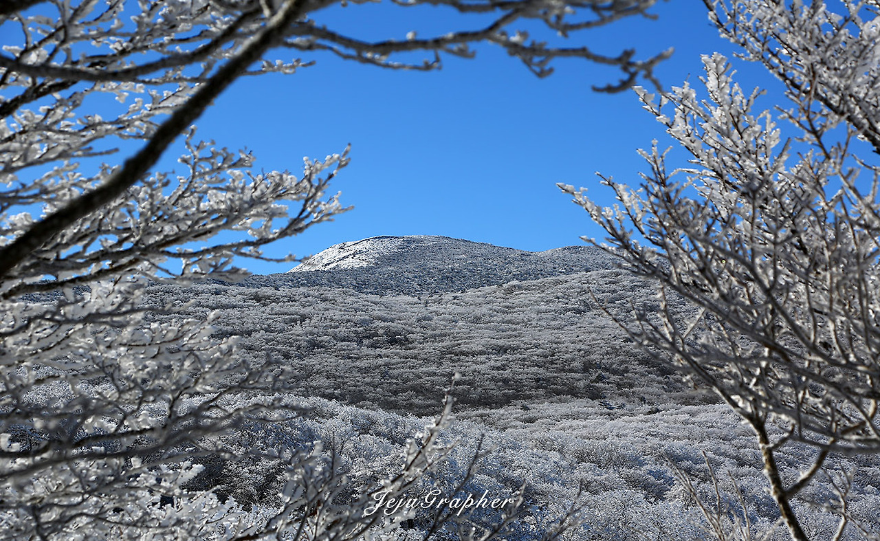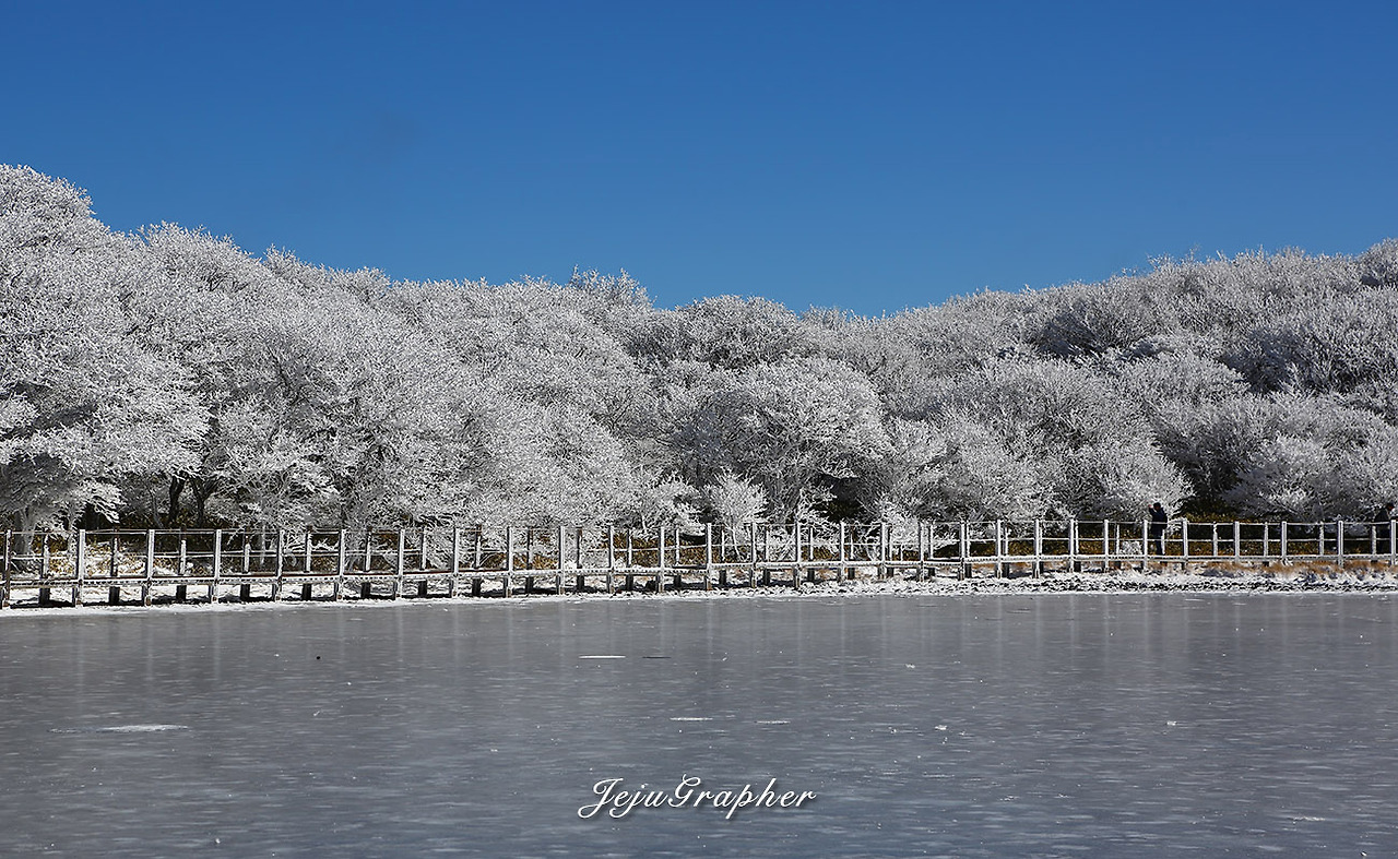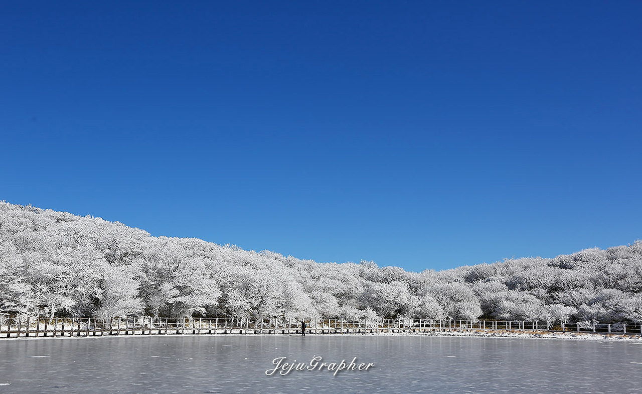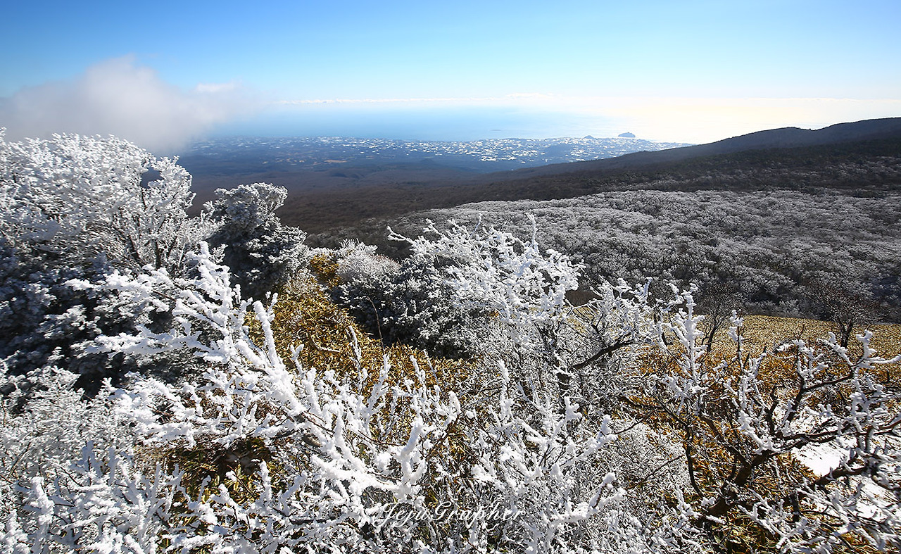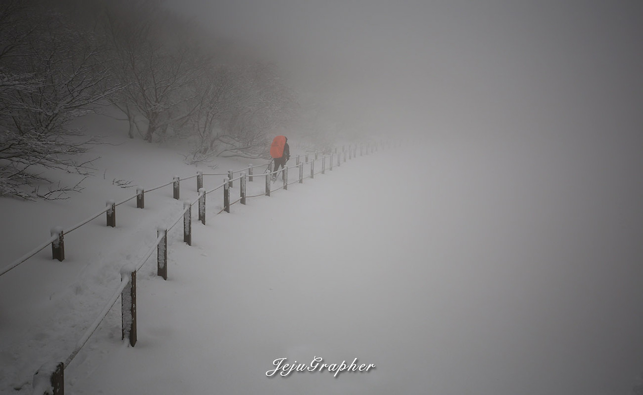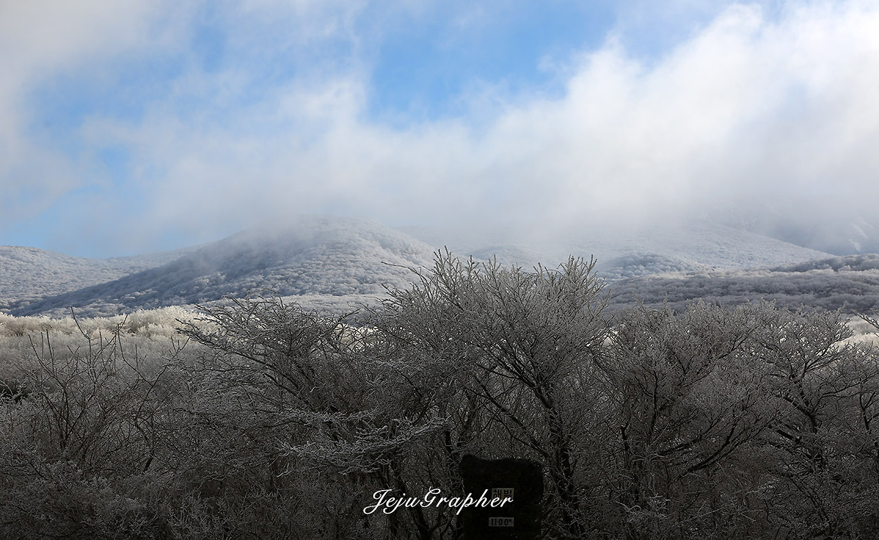 지난 주말에 폭설을 기다렸던 것은 비자림로 사진을 찍겠다는 욕구 때문입니다. 버스 타고 비자림로까지 가서 사진을 찍고 집까지 걸어 내려오는 계획을 세웠습니다. 하지만 아침에 눈을 뜨자마자 창문을 열었을 때 실망할 수밖에 없었습니다. 흰색의 천하를 꿈꿨는데... 실망하며 자리에 그대로 잠시 누워있으면서 그래도 눈을 봐야겠다는 강한 열망이 끓어올랐습니다. 그래서 1100고지의 상고대라도 보기 위해서 차를 몰고 올라갔습니다. 1100고지의 상고대는 겨울의 제주를 호사스럽게 즐기는 가장 좋은 방법입니다. 산 아래에서 볼 때는 구름이 짙은 흐린 날이었지만 막상 1100고지에 오르니 푸른 하늘도 힐끗힐끗 보였습니다. 내일 아침 일찍 사라오름에 올랐다가 출근을 할까?라는 생각도 들었지만 "지금 바로 사라오름에 올라간다면...?"이라는 강한 생각에 1100고지에서 사진도 제대로 찍지 않고 급하게 집으로 내려왔습니다.
