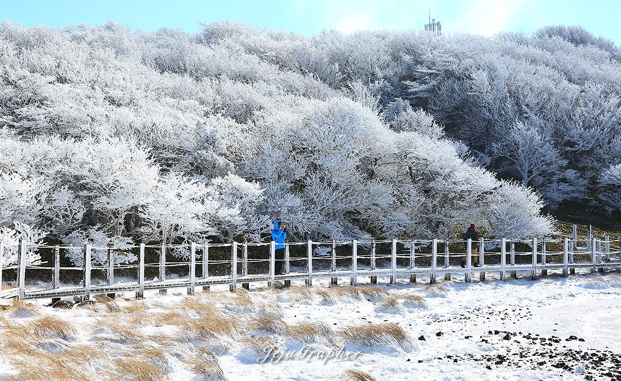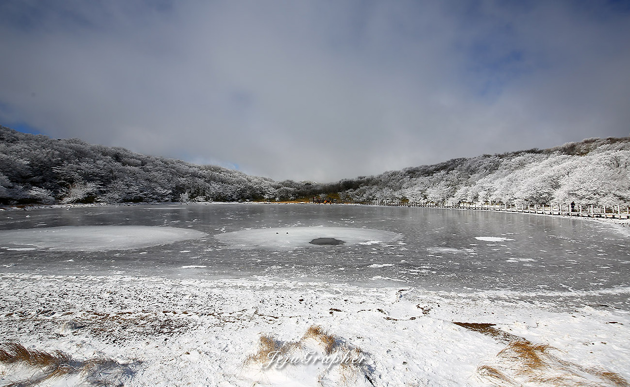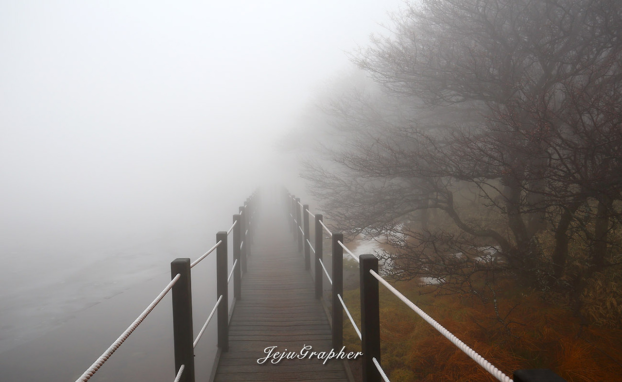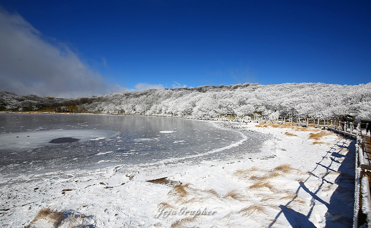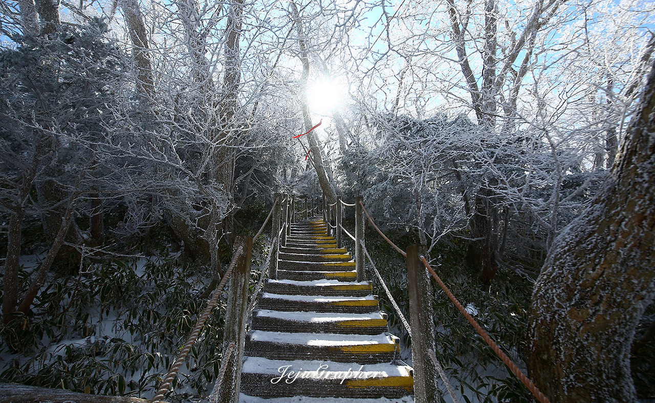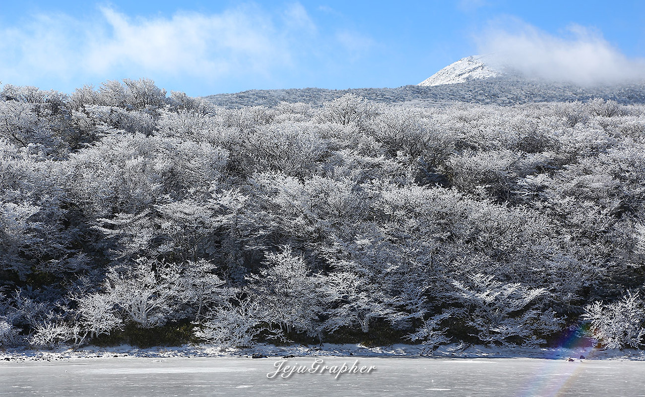 지난 주말에 폭설을 기다렸던 것은 비자림로 사진을 찍겠다는 욕구 때문입니다. 버스 타고 비자림로까지 가서 사진을 찍고 집까지 걸어 내려오는 계획을 세웠습니다. 하지만 아침에 눈을 뜨자마자 창문을 열었을 때 실망할 수밖에 없었습니다. 흰색의 천하를 꿈꿨는데... 실망하며 자리에 그대로 잠시 누워있으면서 그래도 눈을 봐야겠다는 강한 열망이 끓어올랐습니다. 그래서 1100고지의 상고대라도 보기 위해서 차를 몰고 올라갔습니다. 1100고지의 상고대는 겨울의 제주를 호사스럽게 즐기는 가장 좋은 방법입니다. 산 아래에서 볼 때는 구름이 짙은 흐린 날이었지만 막상 1100고지에 오르니 푸른 하늘도 힐끗힐끗 보였습니다. 내일 아침 일찍 사라오름에 올랐다가 출근을 할까?라는 생각도 들었지만 "지금 바로 사라오름에 올라간다면...?"이라는 강한 생각에 1100고지에서 사진도 제대로 찍지 않고 급하게 집으로 내려왔습니다.